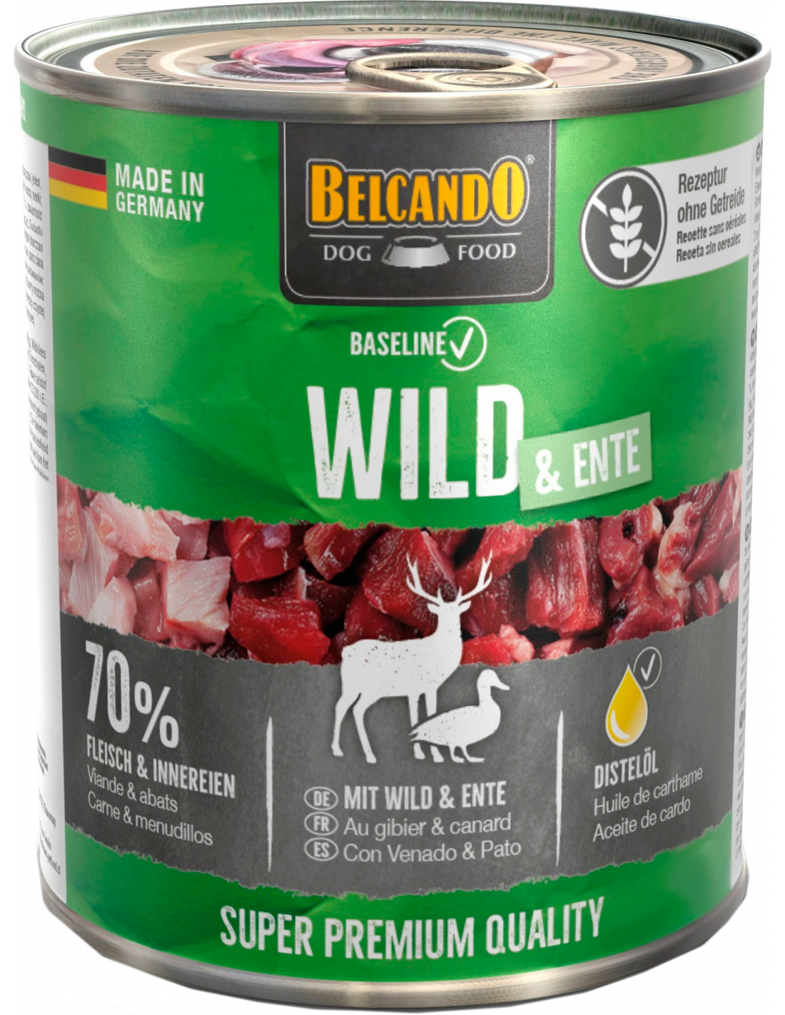 Carne de Venado (Ciervo, Jabalí) (13%); carne de pato (13%); caldo de carne (28,8%); Carne; Hígado; Estómago; Corazón; Riñón; Pulmón; cáscaras de huevo, secas; minerales; Aceite de cártamo (0,2%).