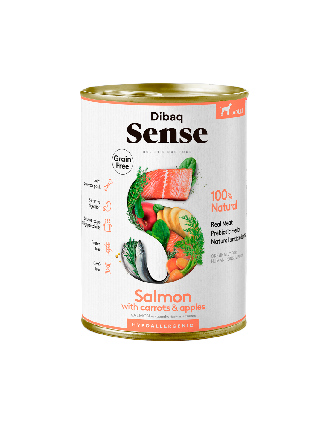 Dibaq Sense Adult Grain Free Salmón Paté es una comida húmeda hipoalergénica elaborada con ingredientes 100% naturales, incluyendo salmón y arenques frescos, frutas y verduras. Diseñada para perros adultos de todas las razas, es una receta Grain Free, sin cereales, gluten, maíz, soja ni huevo, ideal para mascotas con intolerancias.