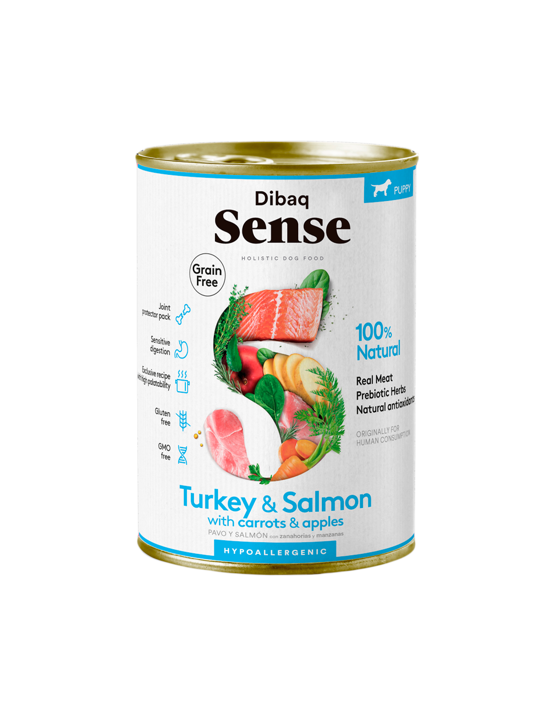 Paté hipoalergénico sin cereales para perros cachorros y madres. Con pavo y salmón fresco, zanahoria y manzana. Lata de 380 gr.