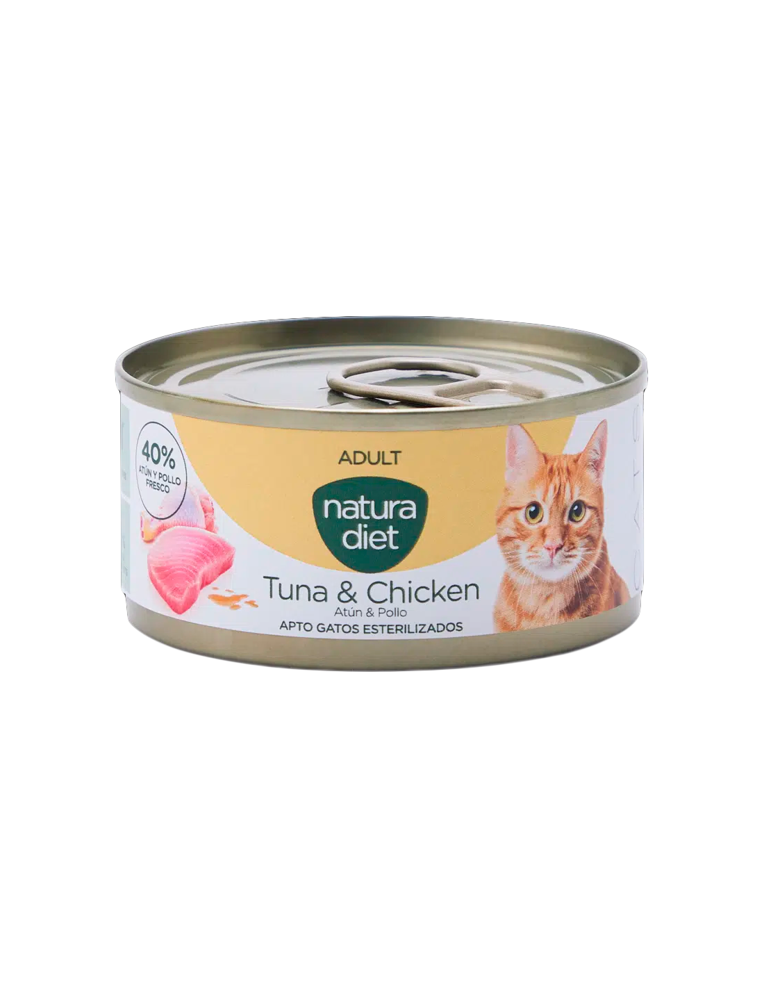 Dingo Natura Diet Cat Adult Esterilizado Atún y Pollo es un alimento húmedo complementario, formulado con ingredientes 100% naturales. Aporta carnes y pescados frescos, proteína y ácidos grasos de alto valor nutricional, sin excesos calóricos, ideal para gatos adultos y esterilizados.