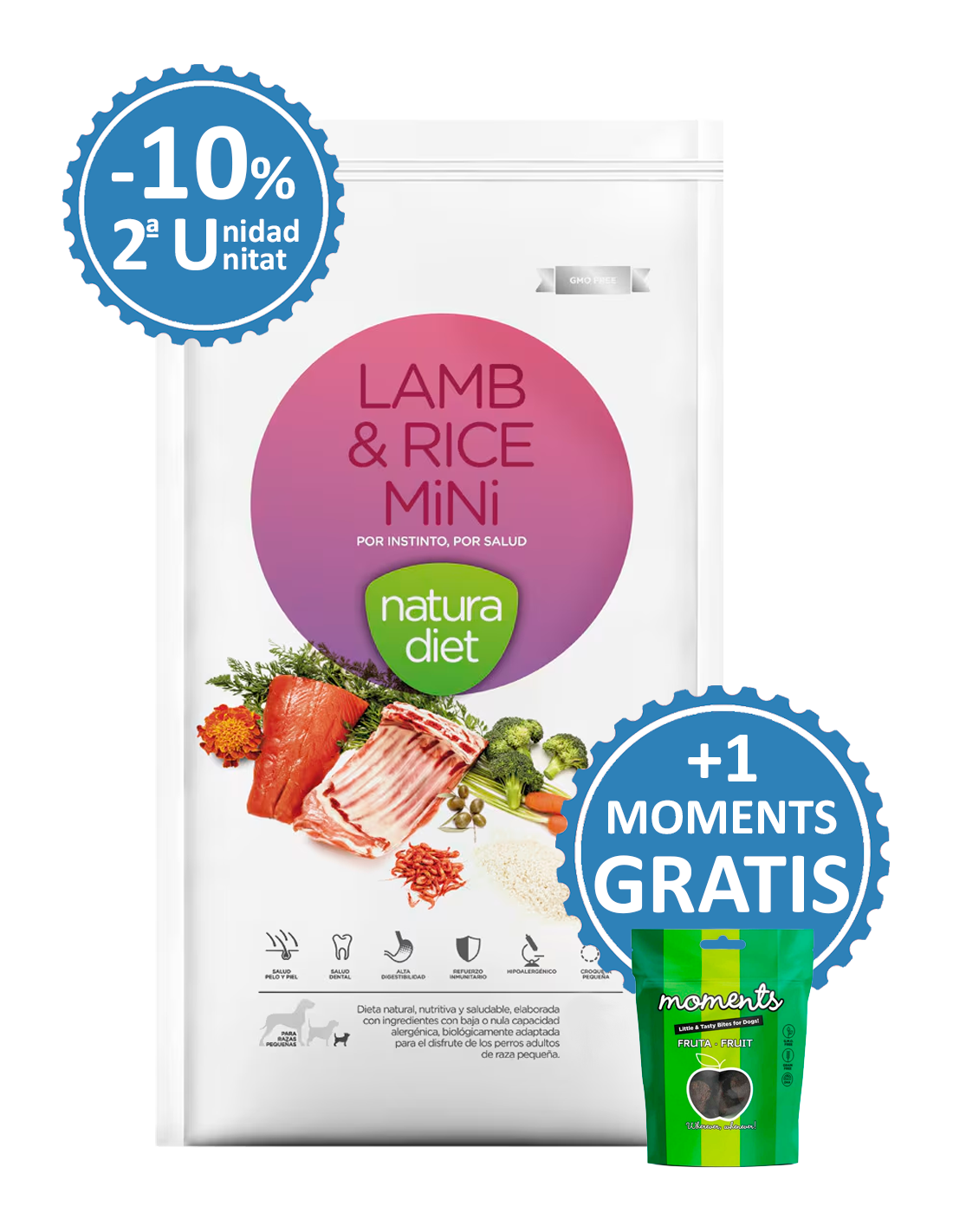 Dingo Natura Diet Adult Lamb & Rice Mini es un alimento completo, saludable e hipoalergénico, elaborado con ingredientes naturales de baja o nula capacidad alergénica. Diseñado para perros adultos de raza pequeña, este pienso refuerza el sistema inmunitario y favorece el mantenimiento de un peso ideal.