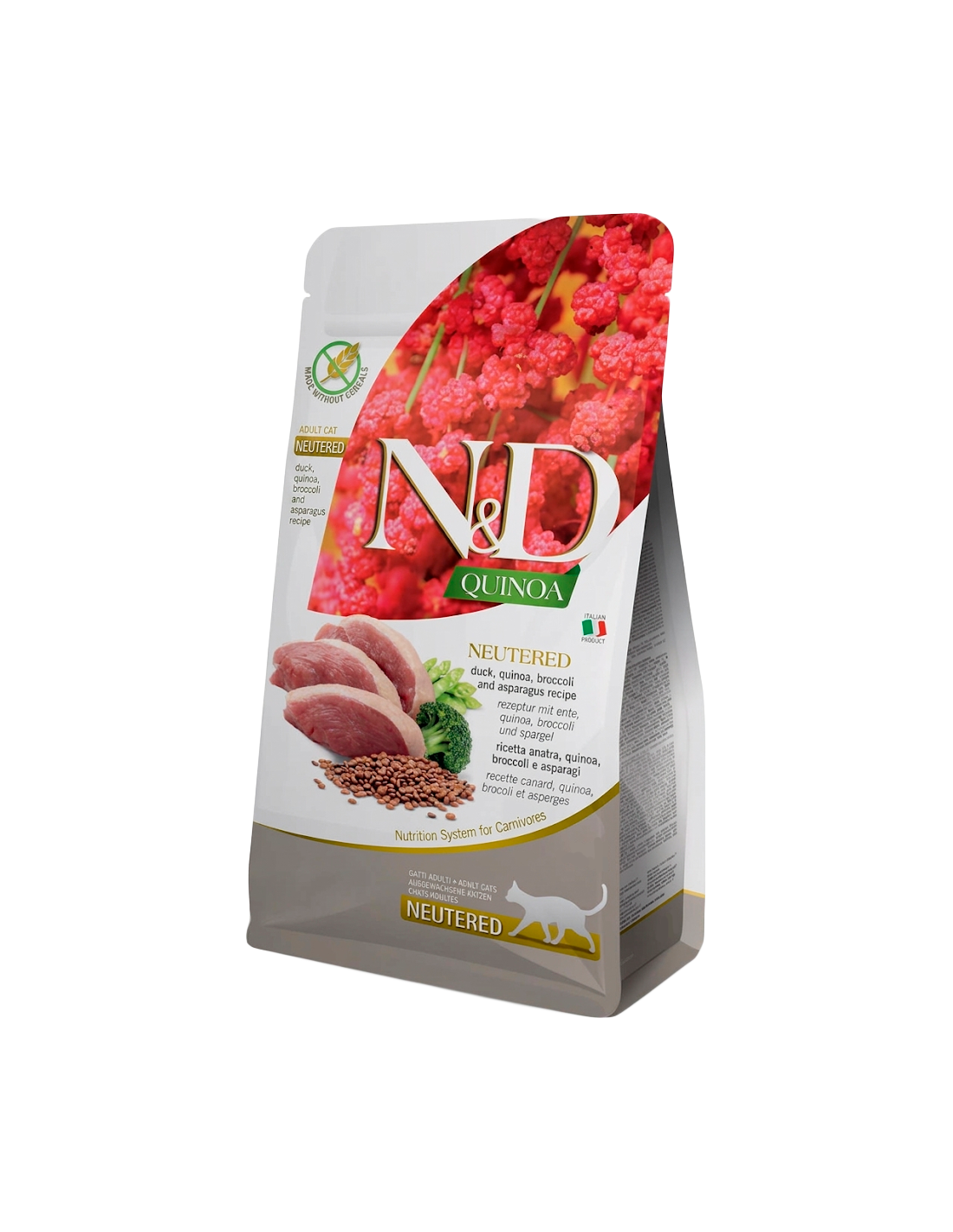 Farmina N&D Quinoa Neutered Adult Pato es un alimento completo formulado específicamente para gatos adultos castrados. Ayuda a combatir la tendencia al aumento de peso en gatos esterilizados, asegurando una nutrición óptima con menor ingesta calórica, alto contenido proteico y fibra, además de propiedades acidificantes urinarias.