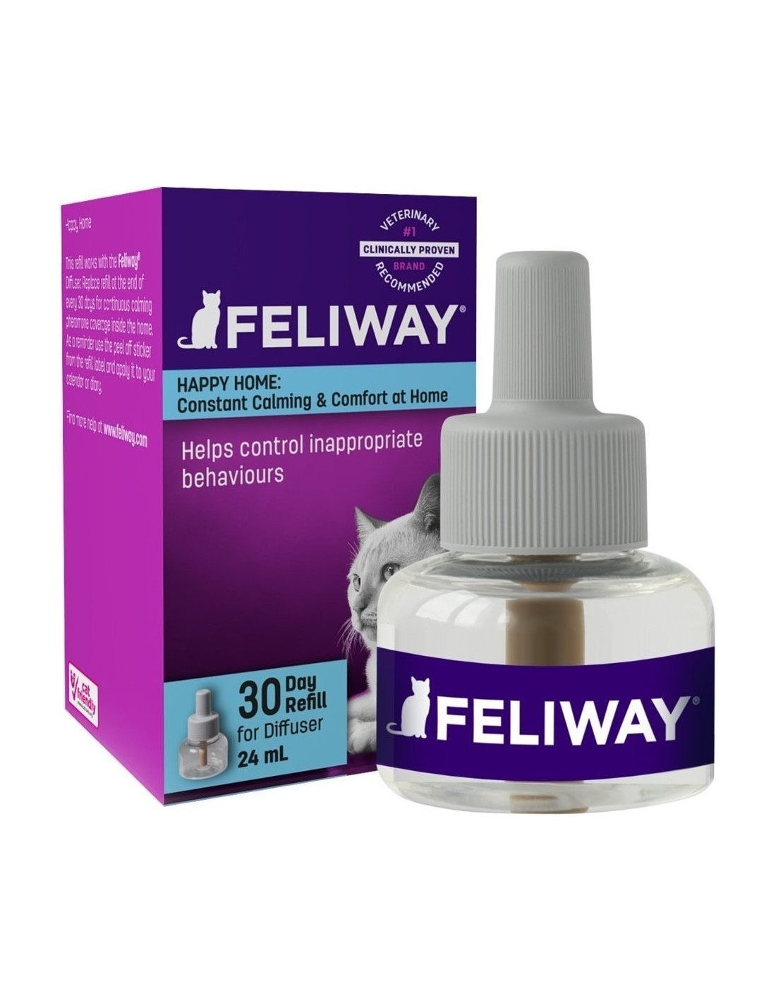 El olor de FELIWAY® Classic calma a los gatos estresados y les hace sentirse bien en situaciones desconocidas, como la mudanzas, el viaje en transportín, la adquisición de objetos nuevos para la casa o entornos ruidosos y desconocidos. FELIWAY® también ayuda a corregir el comportamiento agresivo de tu gato, así como la disminución de las ganas de jugar y de interactuar, el exceso de acicalamiento y la falta de apetito o la insaciabilidad. Esta feromona sintética brinda seguridad a tu gato para que las situaciones de estrés no desemboquen en estas conductas no deseadas.