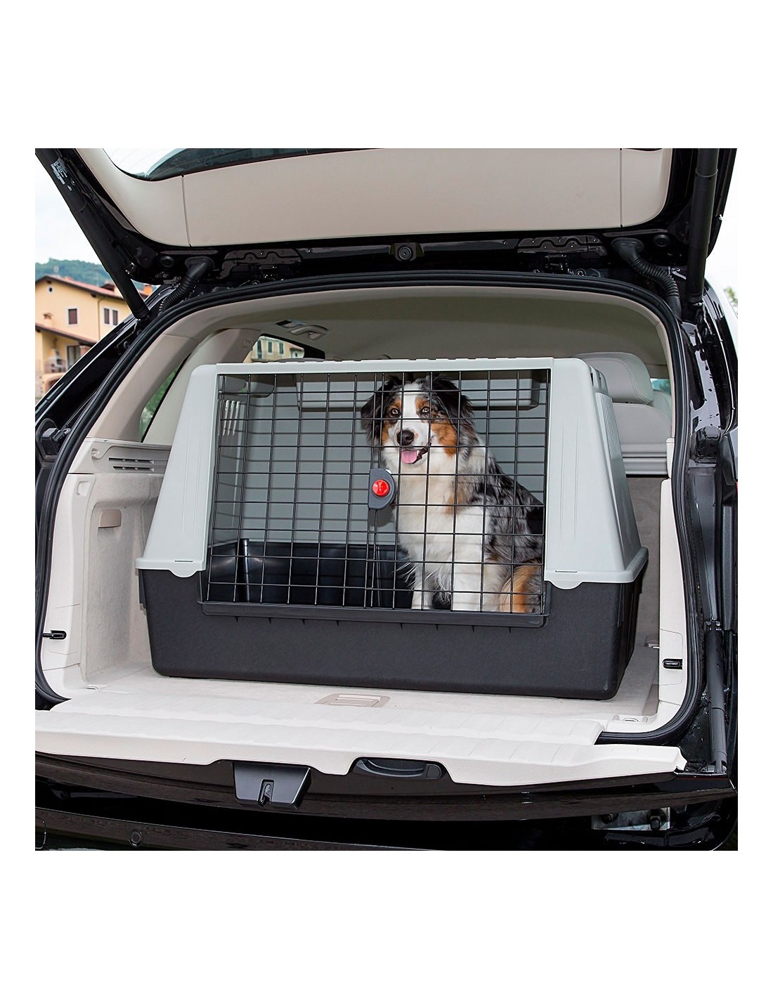El transportín Atlas Car es una sólida y ligera caja de viaje para perros con una puerta de acero cubierto de plástico. Diseñado para ser colocado dentro del maletero de la mayoría de los coches, este es un artículo para perros de tamaño mediano-grande.