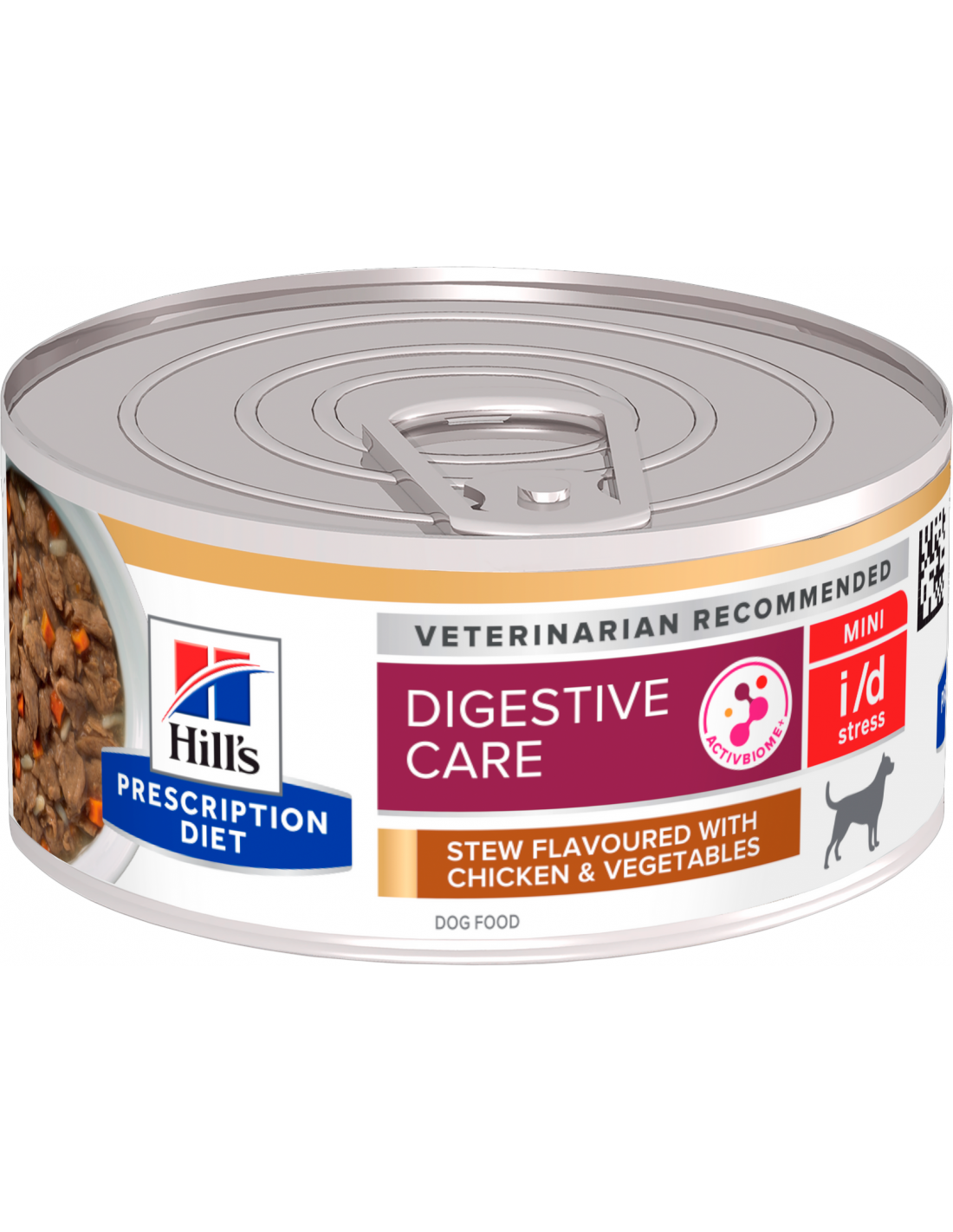 Hill's Prescription Diet i/d Stress Digestive Care Estofado es una nutrición que ha demostrado que calma y controla los signos relacionados con el estrés, incluyendo las molestias digestivas, en perros de menos de 14 kg. Con la exclusiva tecnología ActivBiome+ de Hill's, nutre rápidamente al microbioma intestinal para favorecer la salud digestiva y el bienestar general.