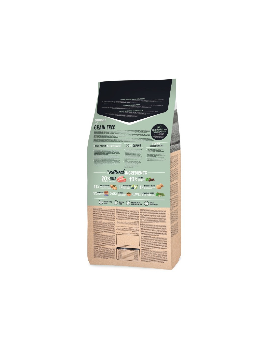 Ownat Grain Free Just Adult Pollo, elaborado con un 20% de carne fresca y muy rico en ingredientes de origen animal.
