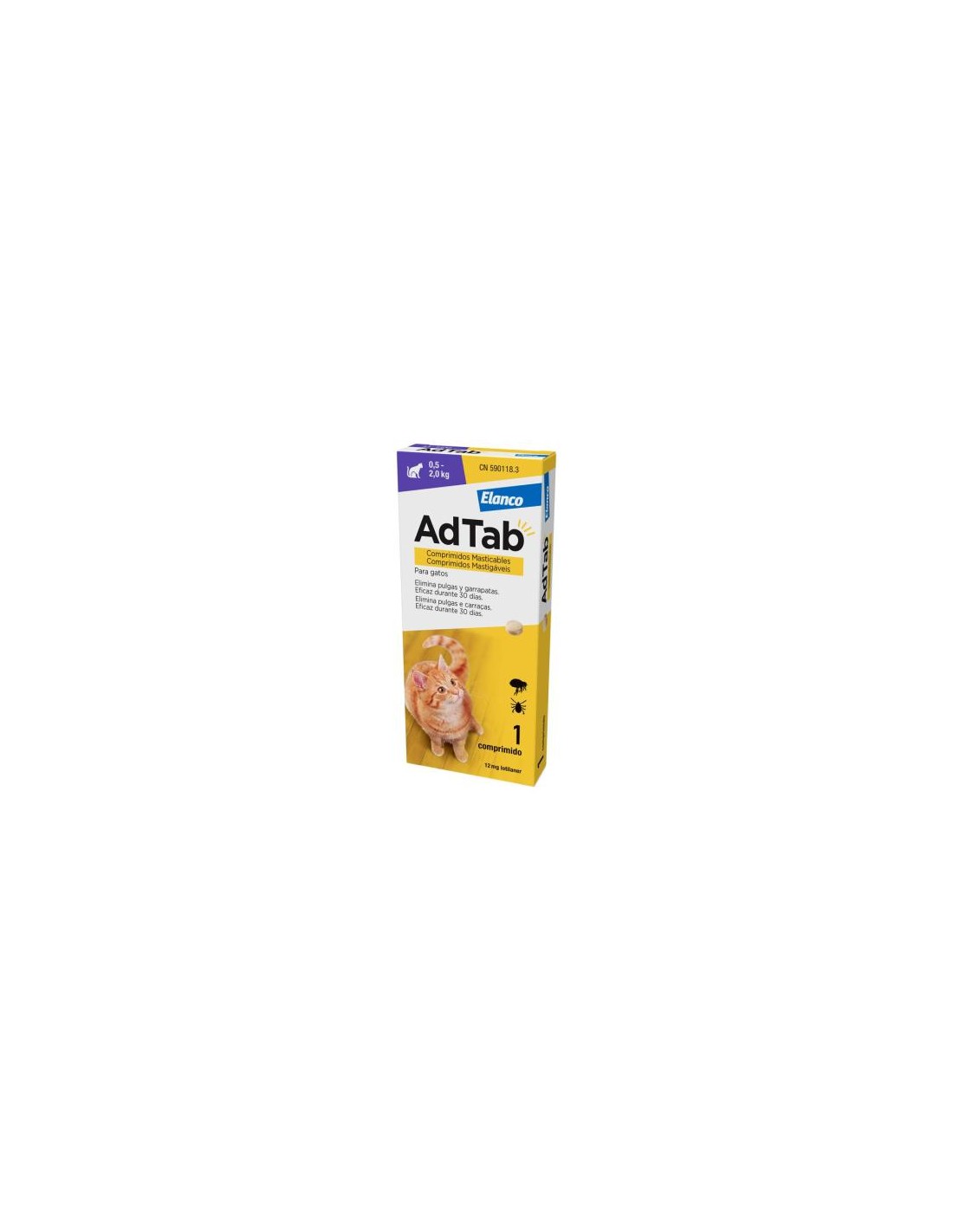 AdTab es un medicamento veterinario que proporciona una acción inmediata y persistente durante un 1 mes de eliminación de pulgas (Ctenocephalides felis y C. canis) y garrapatas (Rhipicephalus sanguineus, Ixodes ricinus, I. hexagonus y Dermacentor reticulatus). Está indicado para gatos de 8 semanas de edad o más y de 0,5 kg de peso o más.