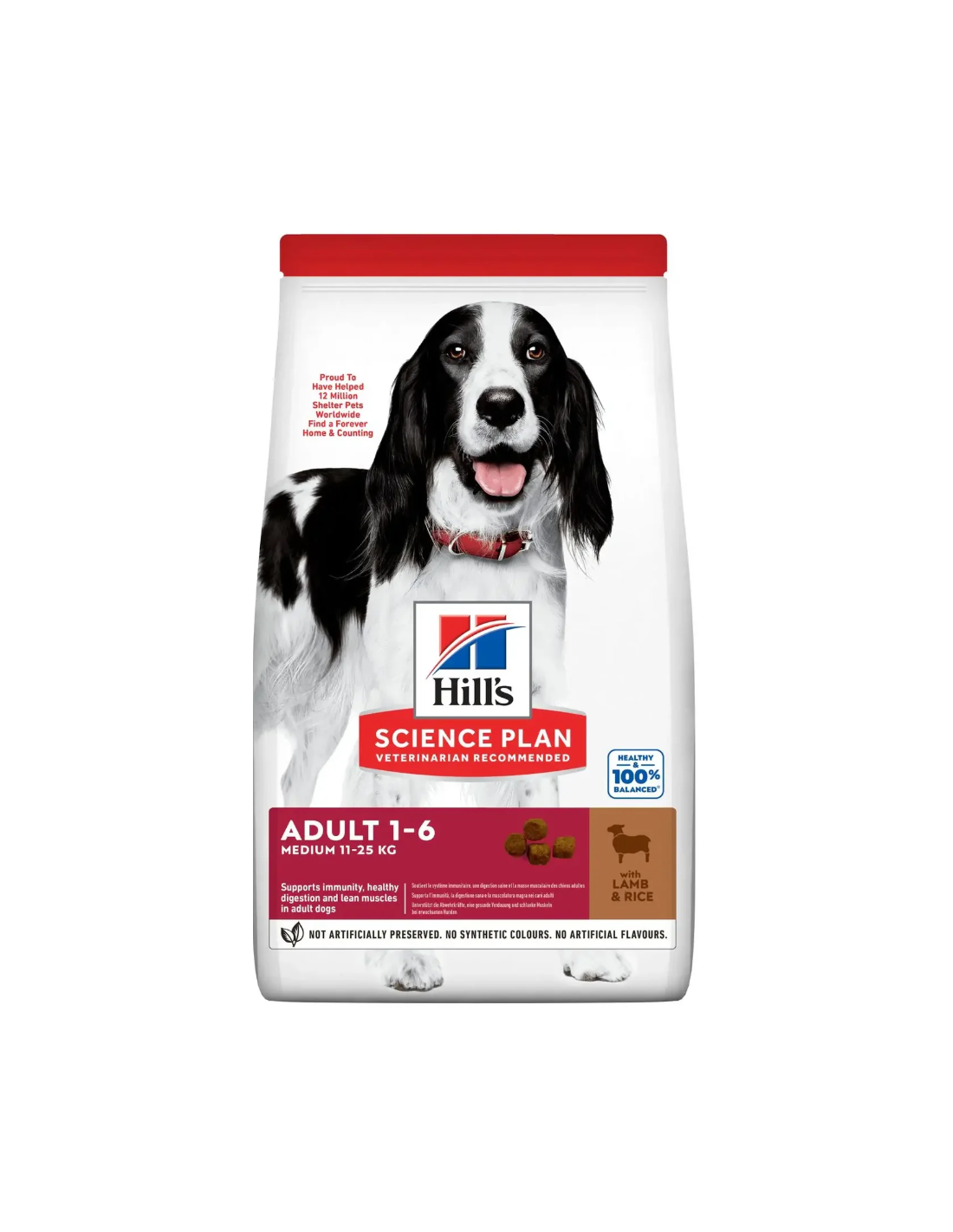 Hill's Science Plan MEDIUM ALIMENTO PARA PERROS ADULTOS con CORDERO (9%) y ARROZ (6%) es un alimento completo para perros adultos medianos de 1 a 6 años de edad.