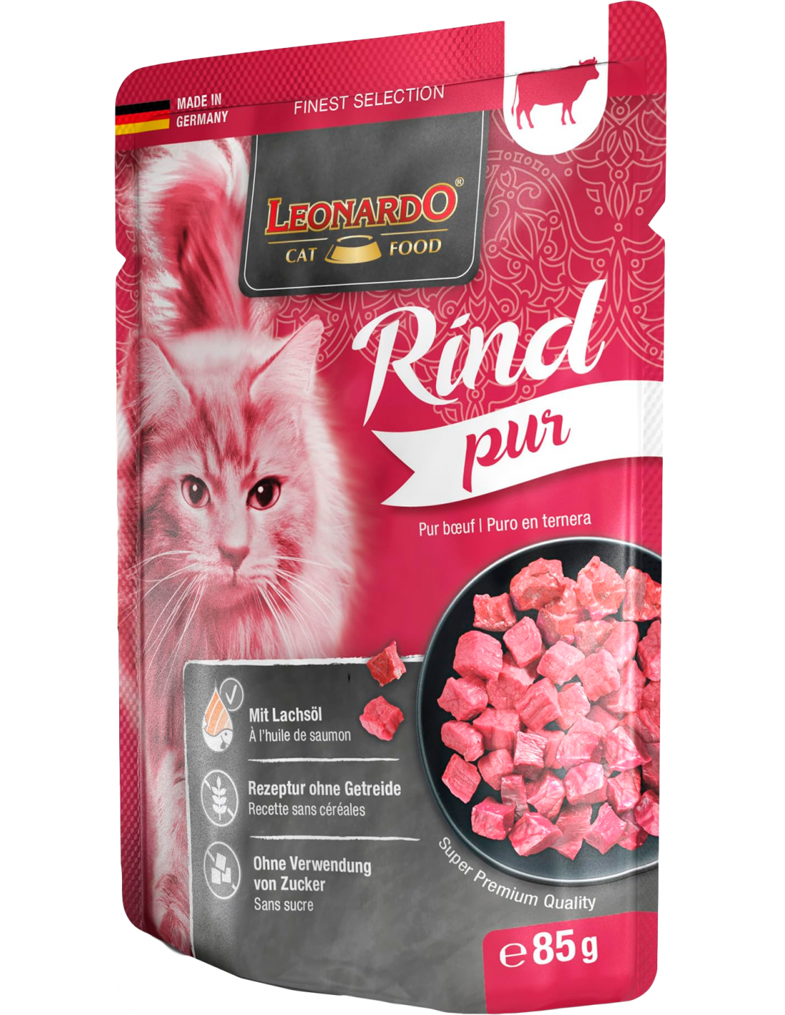 LEONARDO puro en Ternera es una variedad de gran sabor con carne de vacuno jugosa y de alta calidad. Contiene minerales añadidos y ácidos grasos poliinsaturados del aceite de salmón, proporcionando más sabor y un pelaje suave y brillante.