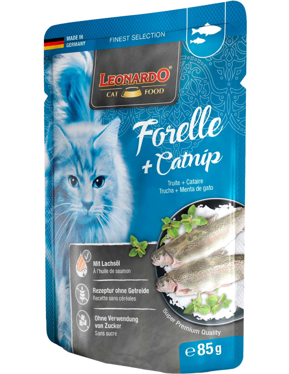 LEONARDO Trucha + Catnip es una combinación irresistible de trucha tierna, fuente de proteínas de alta calidad y valiosos ácidos grasos omega-3, con catnip que atrae de forma natural a tu gato. Esta receta garantiza un pelo brillante gracias a los ácidos grasos poliinsaturados del aceite de salmón.
