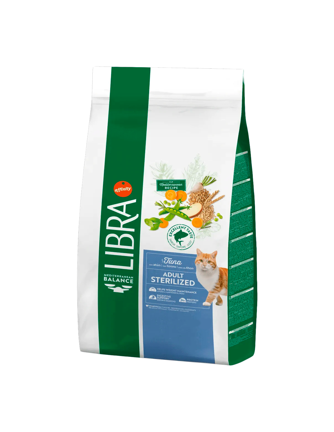 Libra Cat Adult Sterilized Atún es una receta mediterránea completa y equilibrada, diseñada para gatos adultos esterilizados. Con Atún como ingrediente principal, contiene un 10% menos de grasa que Libra Adult y una correcta proporción de nutrientes esenciales para ayudar a mantener el peso, favorecer la masa muscular y cuidar la piel y el pelo.
