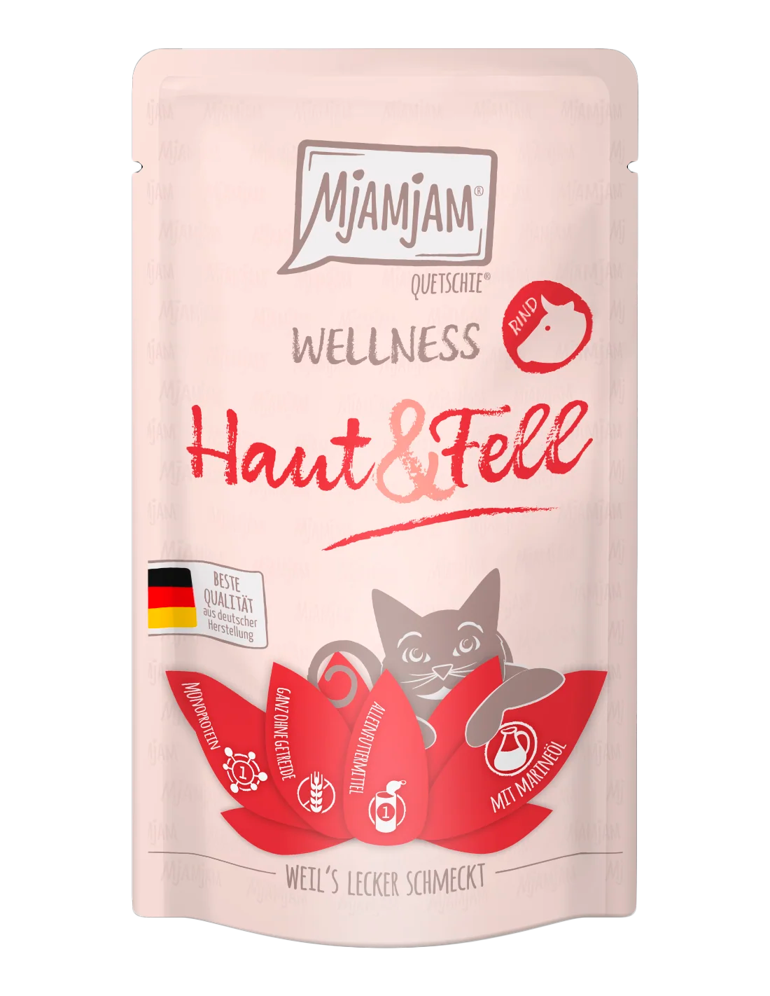 MjAMjAM Wellness Piel y Pelo Vacuno es una receta natural y equilibrada diseñada para mejorar la salud de la piel y el brillo del pelaje de tu gato. Con carne fresca de ternera como fuente principal de proteínas, incluye achicoria para la digestión y levadura para fortalecer piel y pelaje. Sin cereales ni aditivos artificiales, ideal para gatos con piel sensible.