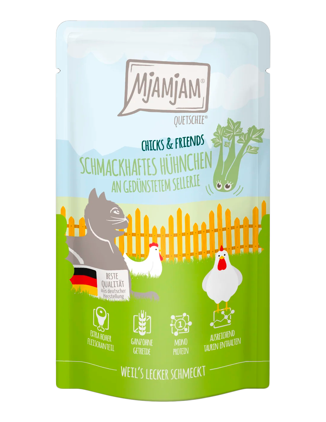 MjAMjAM Cat Pollo con Apio es un alimento húmedo completo sin cereales para gatos. El sabroso pollo combinado con apio al vapor ofrece una experiencia culinaria única, proporcionando todas las vitaminas y minerales esenciales. Destaca por su alto contenido de carne y la ausencia de cereales, azúcares añadidos o conservantes sintéticos.