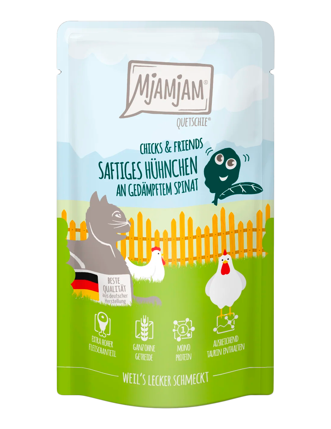 MjAMjAM Cat Pollo con Espinacas es un alimento húmedo completo sin cereales para gatos. El sabroso pollo combinado con espinacas al vapor ofrece una experiencia culinaria única, proporcionando todas las vitaminas y minerales esenciales. Destaca por su alto contenido de carne y la ausencia de cereales, azúcares añadidos o conservantes sintéticos.