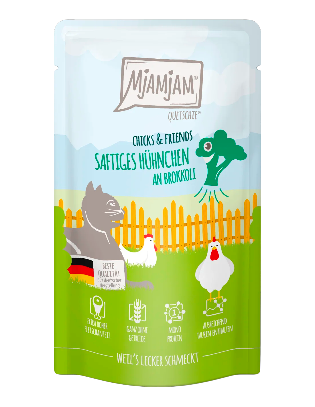 MjAMjAM Cat Pollo con Brócoli es un alimento húmedo completo sin cereales para gatos. El sabroso pollo combinado con brócoli ofrece una experiencia culinaria única, proporcionando todas las vitaminas y minerales esenciales. Destaca por su alto contenido de carne y la ausencia de cereales, azúcares añadidos o conservantes sintéticos.