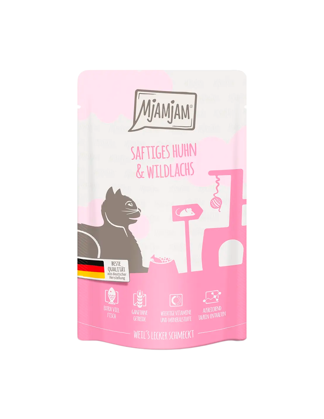 MjAMjAM Cat Pollo y Salmón salvaje es un alimento completo sin cereales para gatos. El salmón fresco combinado con pollo jugoso ofrece una experiencia culinaria única, proporcionando todas las vitaminas y minerales esenciales. Es un alimento natural de calidad superior con un contenido extra alto de carne.