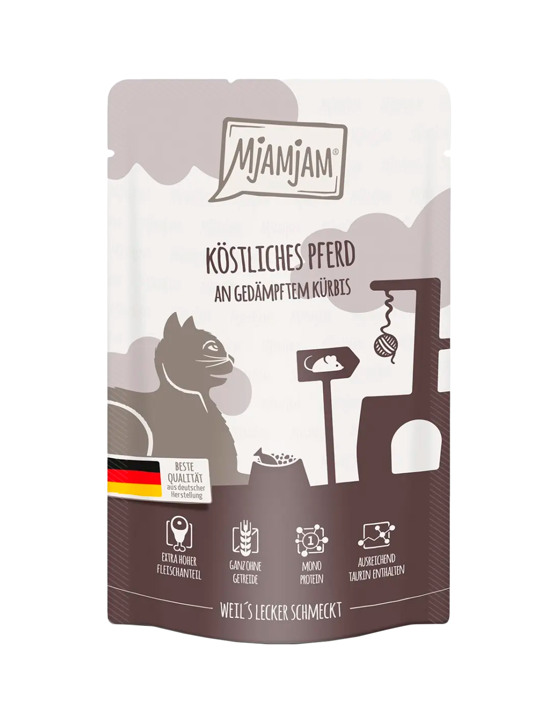 MjAMjAM Cat Caballo con Calabaza al Vapor es un alimento completo sin cereales para gatos. Este delicioso paté de caballo con calabaza al vapor ofrece una experiencia culinaria única y exclusiva, proporcionando todas las vitaminas y minerales esenciales para tu gato.