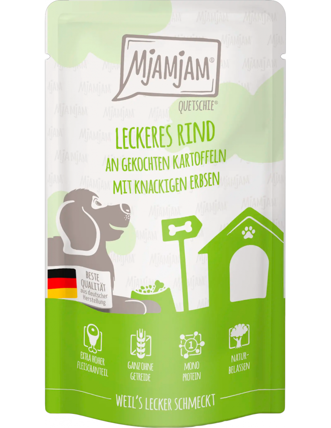 MjAMjAM Dog Ternera con Patatas y Guisantes es un menú completo elaborado con carne de res fresca, patatas saludables y guisantes. Esta comida húmeda natural y de calidad superior proporciona todas las vitaminas y minerales importantes que tu perro necesita, siendo además monoproteica y sin cereales ni gluten.