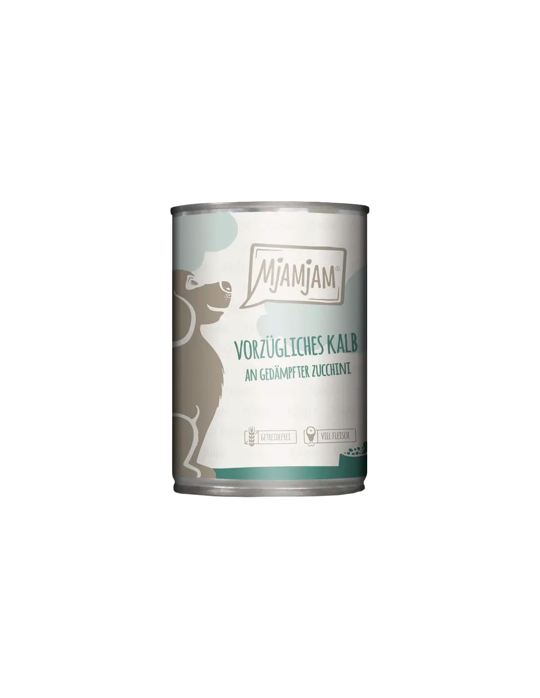 MjAMjAM Dog Ternera con Calabacín al Vapor es un menú completo y natural para perros, con un contenido muy elevado de carne de ternera (monoproteico) y complementado con calabacín al vapor. Ideal para variar la dieta de tu peludo, esta receta es completamente libre de cereales y gluten, perfecta para perros con alergias o intolerancias.