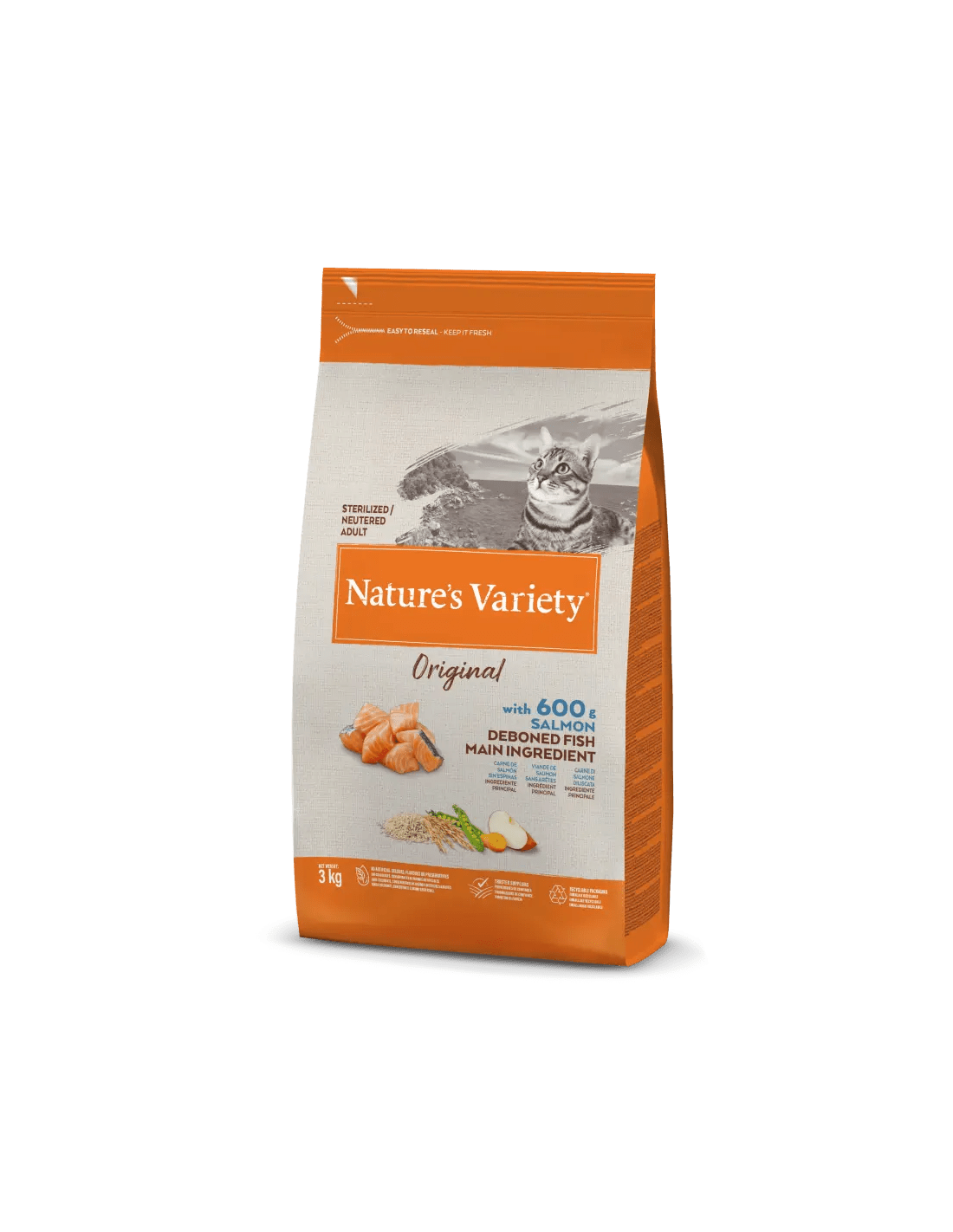 Alimento completo y equilibrado para gatos adultos esterilizados. Elaborado con carne de salmón sin espinas como principal ingrediente. Complementado con frutas y verduras seleccionadas con atención.
