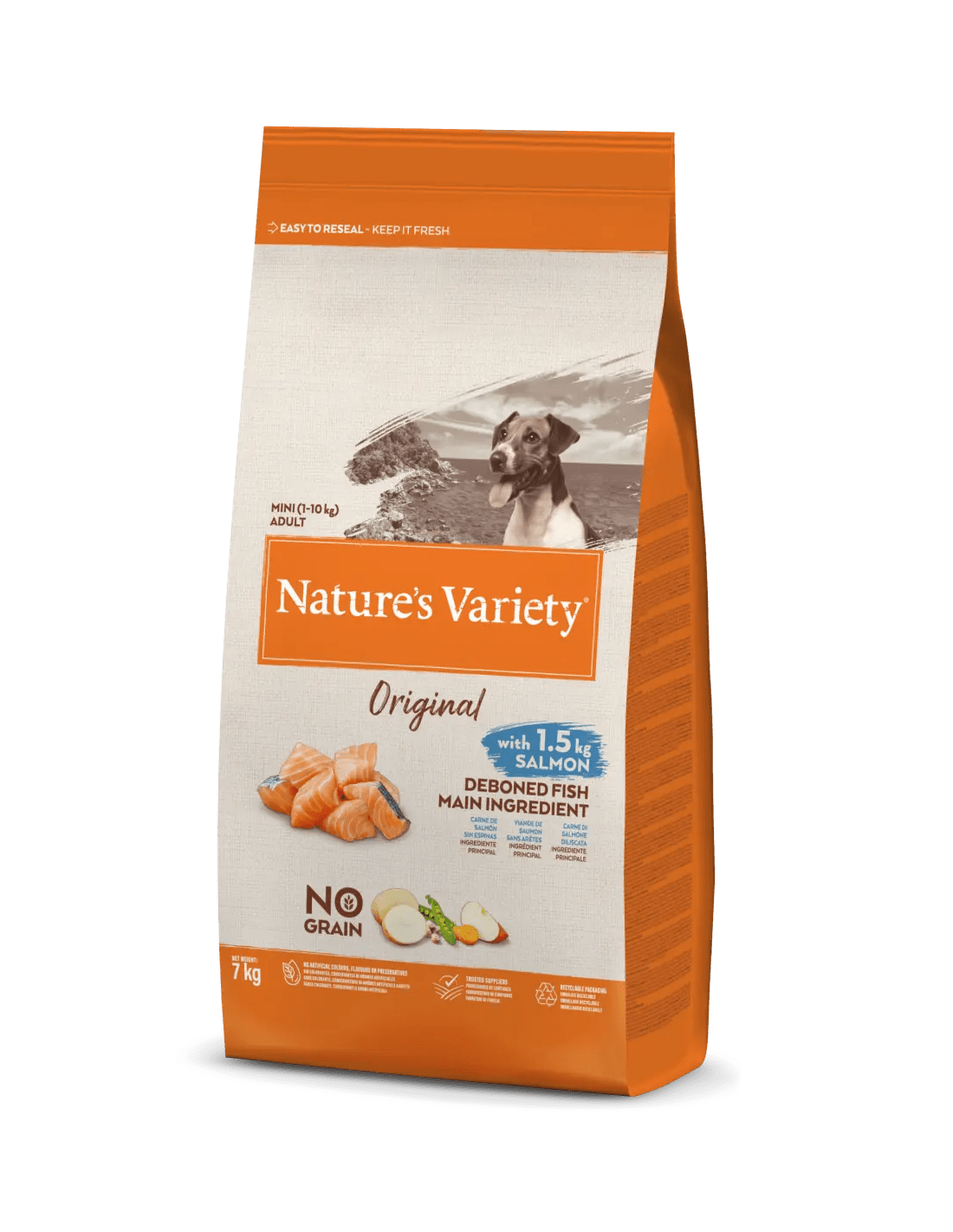 Alimento completo para perros adultos mini, sin cereales. Elaborado con carne de salmón sin espinas como principal ingrediente,frutas y verduras seleccionadas con atención y cereales integrales.