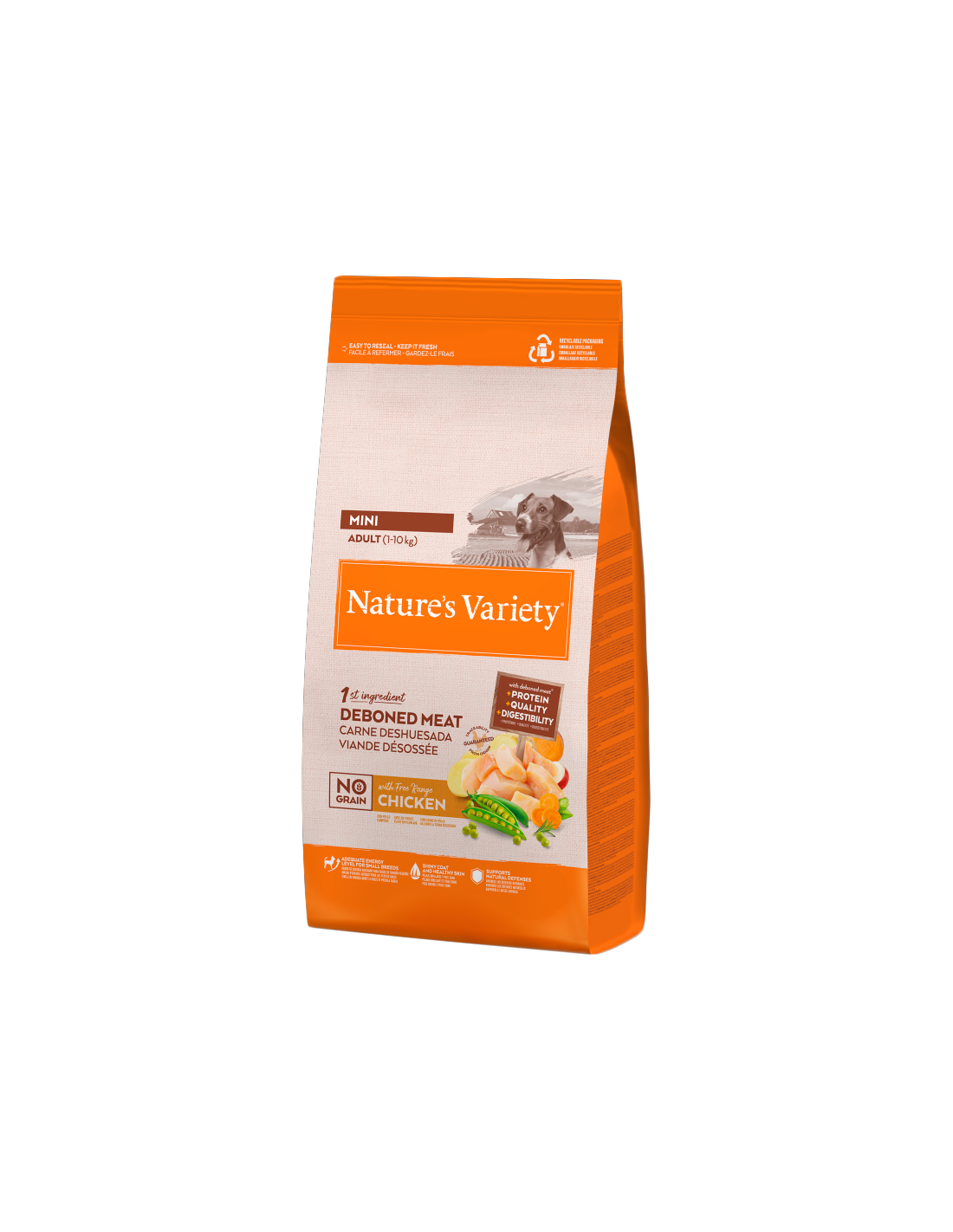 Nature's Variety Adult Mini No Grain Pollo es un alimento completo y equilibrado sin cereales, diseñado para perros adultos de pequeño tamaño. Elaborado con carne de pollo deshuesada como ingrediente principal, y complementado con frutas, verduras y superalimentos, proporciona el nivel de energía adecuado, un pelaje brillante y refuerza las defensas naturales.