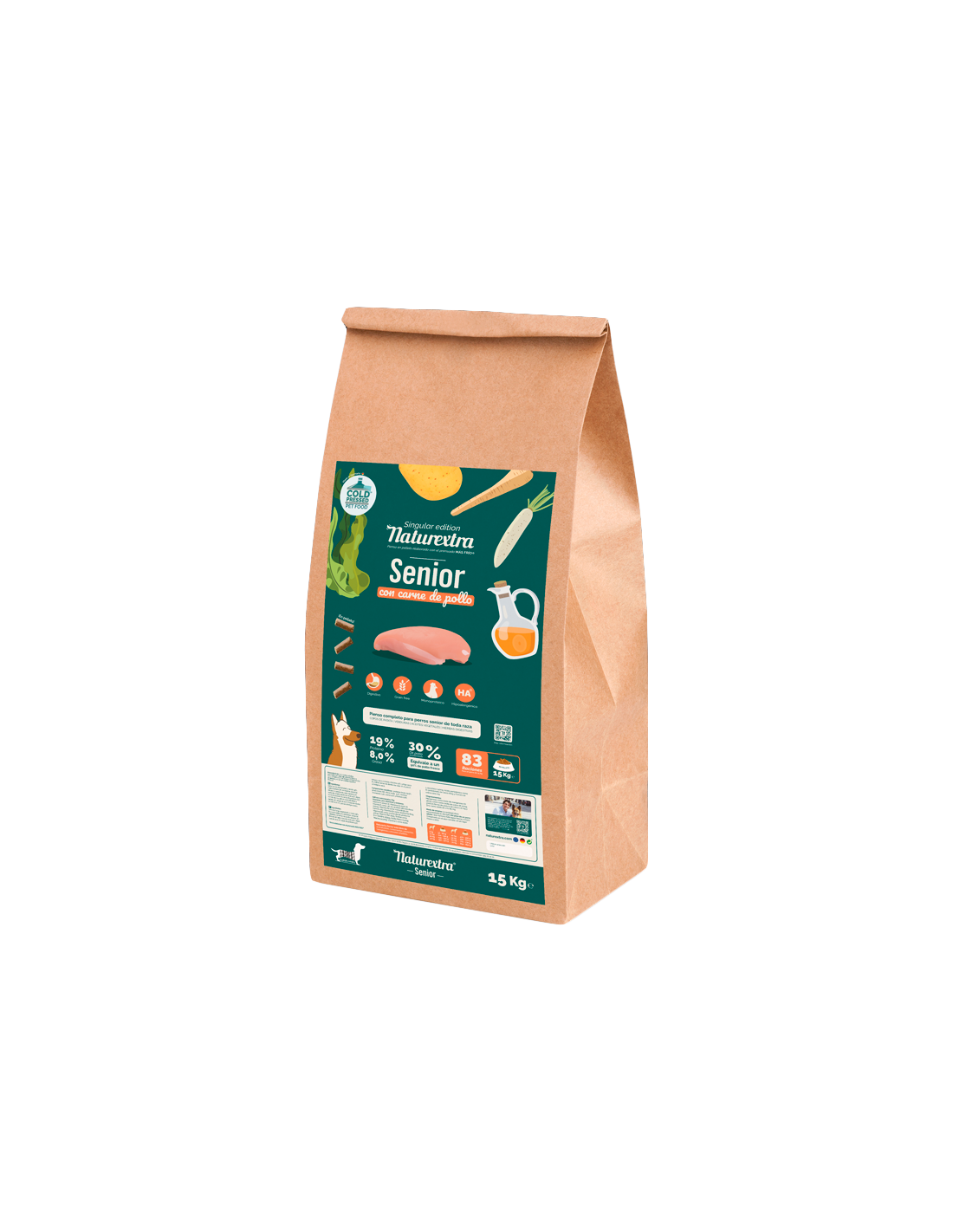 Naturextra Dog Light / Senior es un pienso completo y dietético, prensado en frío (35-40ºC), diseñado para perros con sobrepeso, poco activos o senior. Esta fórmula hipoalergénica y monoproteica, sin cereales, es ideal para perros con alergias, intolerancias alimentarias o un sistema digestivo delicado, preservando los nutrientes esenciales gracias a su método de elaboración.