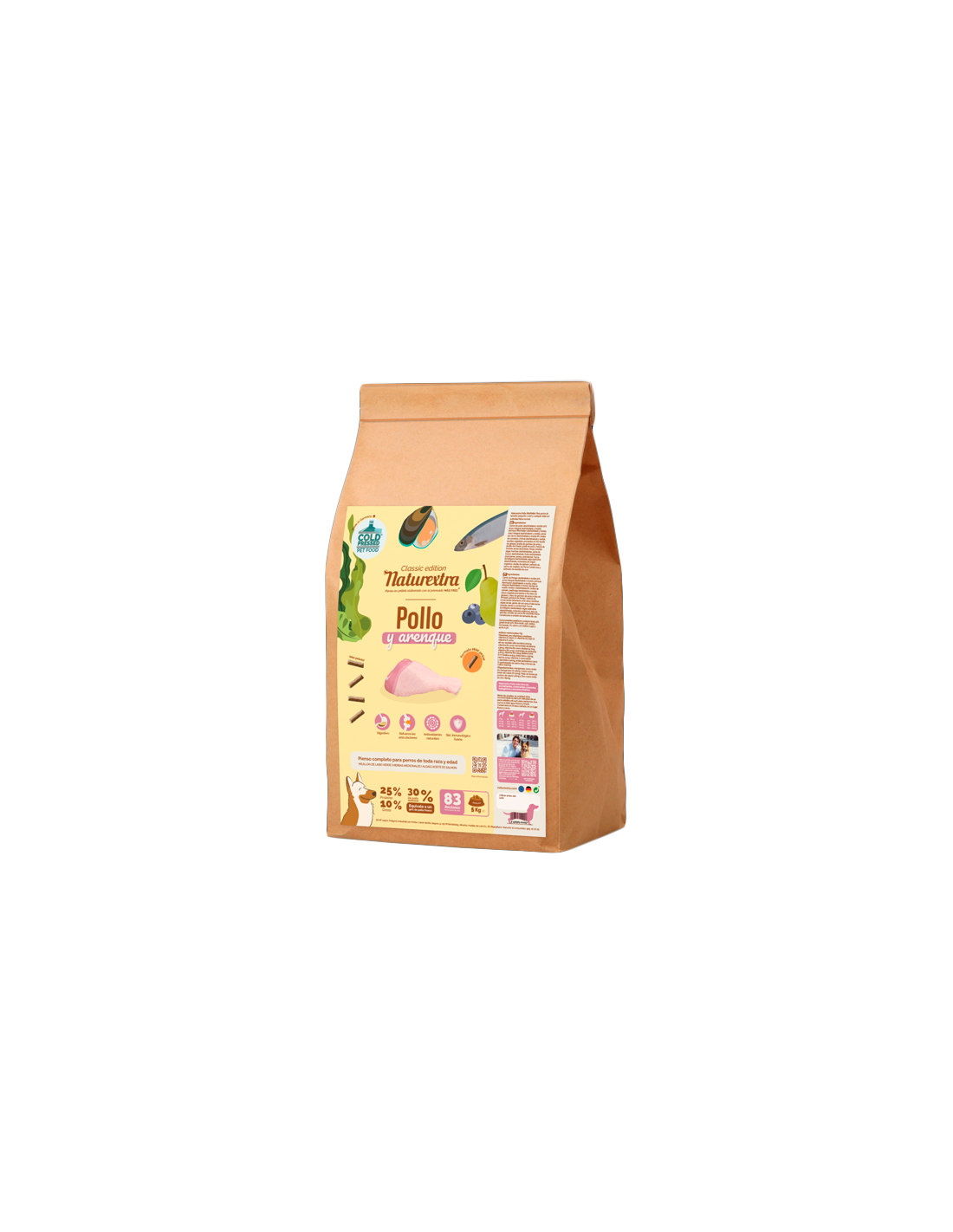 Naturextra Pollo y Arenque Mini es nuestro producto estrella en formato minipellet, ideal para razas pequeñas, cachorros y perros con problemas dentales o dificultades para masticar. Es un pienso prensado en frío, sin extrusionar, elaborado con ingredientes naturales de alta calidad como pollo de granja, arenque y aceite de salmón, perfecto para perros con sensibilidades alimentarias o digestivas.