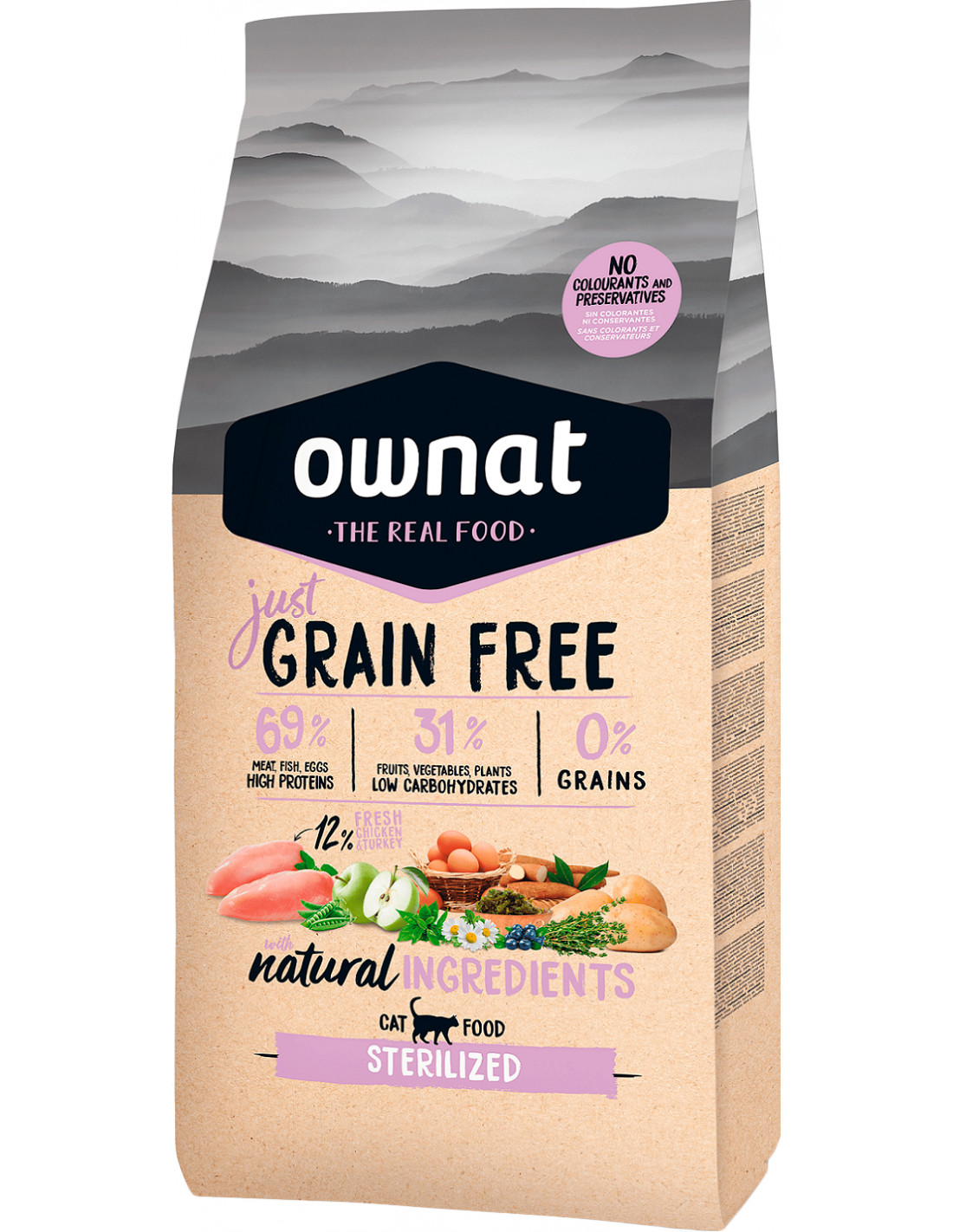 OWNAT GF JUST STERILIZED (CAT) es un pienso natural "Grain Free" diseñado para gatos esterilizados, quienes tienen una tendencia natural al sobrepeso. Su fórmula ayuda a mantener el peso ideal con un aporte reducido de grasas y una elevada proporción de proteínas, asegurando el correcto mantenimiento fisiológico y una digestión saludable.