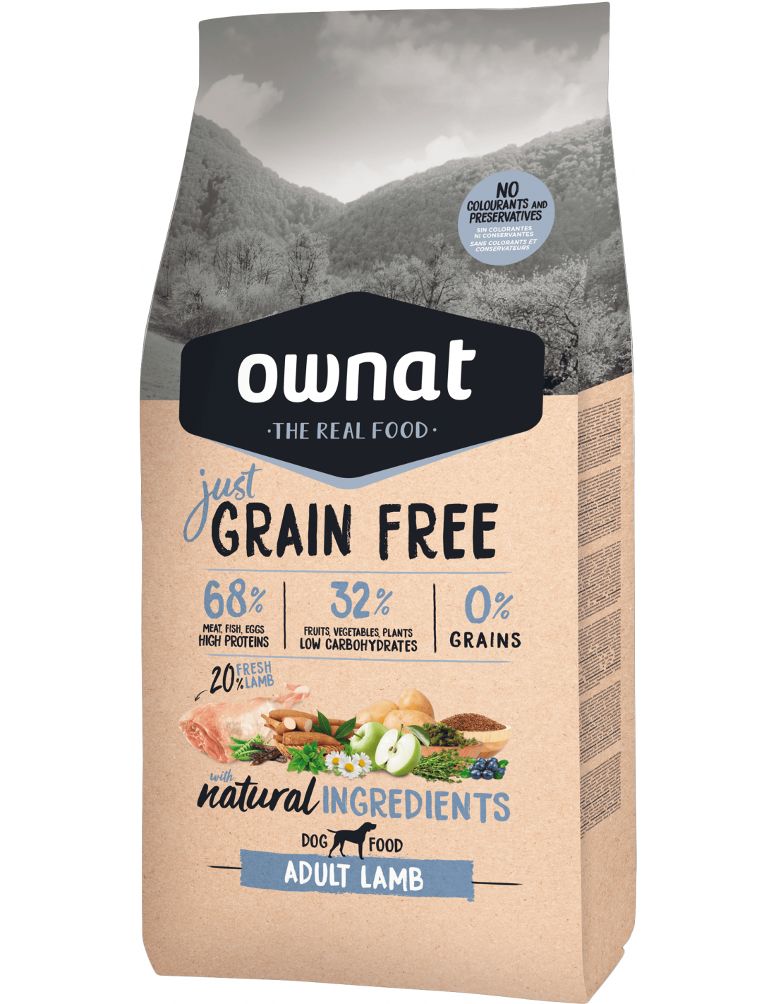 OWNAT GF JUST ADULT LAMB es un alimento completo y equilibrado, formulado con un 20% de carne fresca de cordero y sin cereales. Es ideal para perros adultos con un nivel de actividad normal y especialmente indicado para aquellos con sensibilidades o intolerancias al pollo o a los cereales.