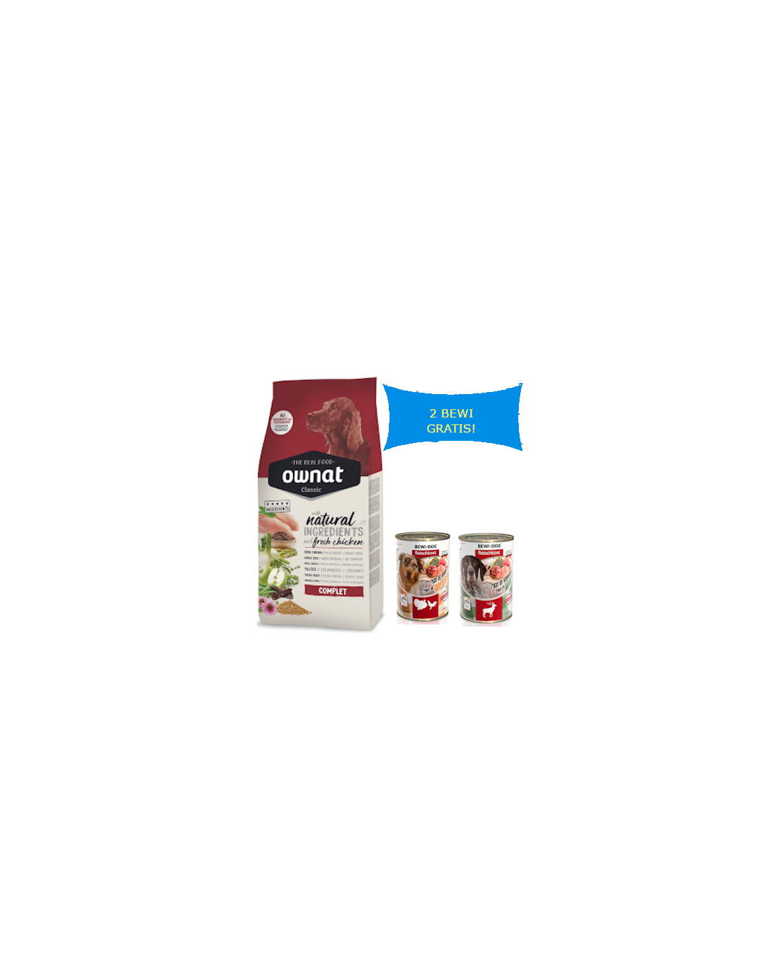 Pack Ownat Classic Complete Adulto Pollo. El saco de 20 kg viene con 2 latas variadas de 400 gr Bewital