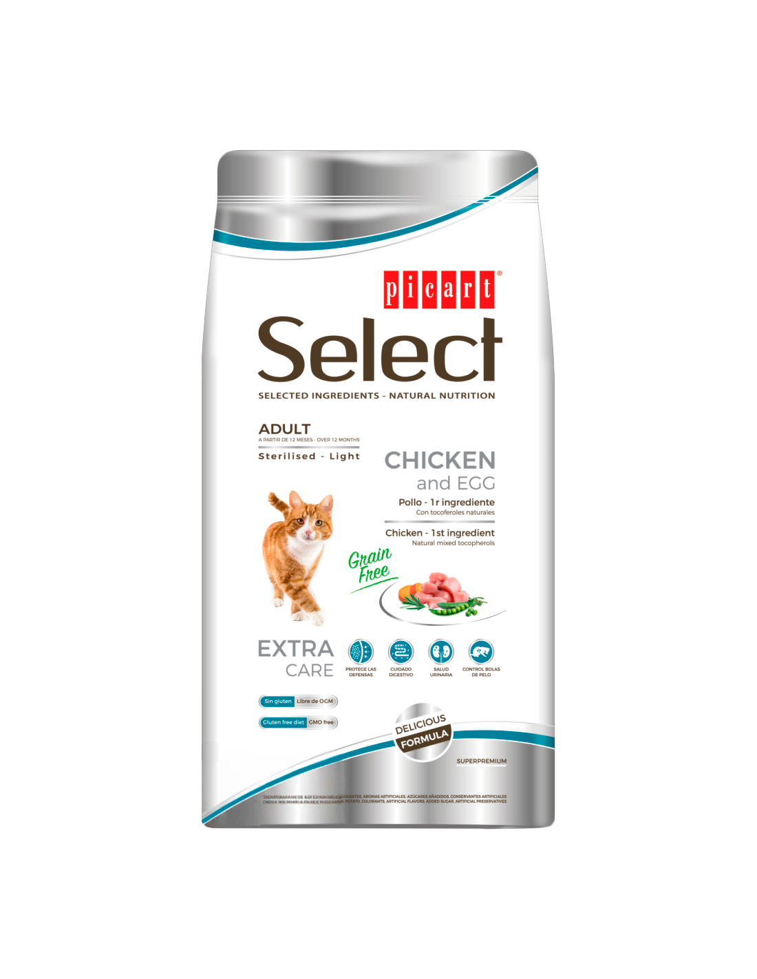 Picart Select Cat Adult Grain Free Sterilised es una alimentación completa y equilibrada, sin cereales, diseñada para gatos esterilizados a partir de los 12 meses. Formulado con pollo y huevo, es ideal para ayudar a mantener un peso saludable, facilitar digestiones ligeras y prevenir la formación de cálculos urinarios, a la vez que promueve un sistema inmunitario sano.