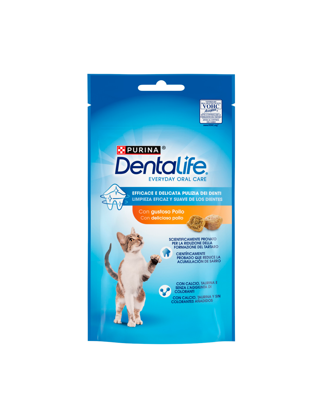 Los snacks PURINA DENTALIFE Cat Adult Pollo están científicamente probados para la higiene dental diaria de tu gato. Su textura porosa crujiente limpia eficazmente todos los lados de los dientes, reduciendo la acumulación de sarro y manteniendo las encías sanas, además de contribuir a un aliento fresco. Contienen calcio y taurina.
