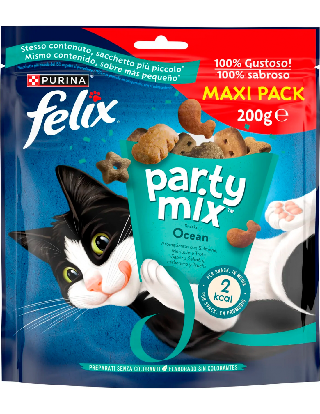 Purina Felix Party Mix Ocean son una irresistible y colorida mezcla de jugosos snacks con sabor a salmón, carbonero y trucha. Elaborados con ingredientes de calidad, contienen proteínas, vitaminas y ácidos grasos Omega 6 para ayudar a tu gato a vivir saludable y feliz. ¡Sin colorantes artificiales añadidos!