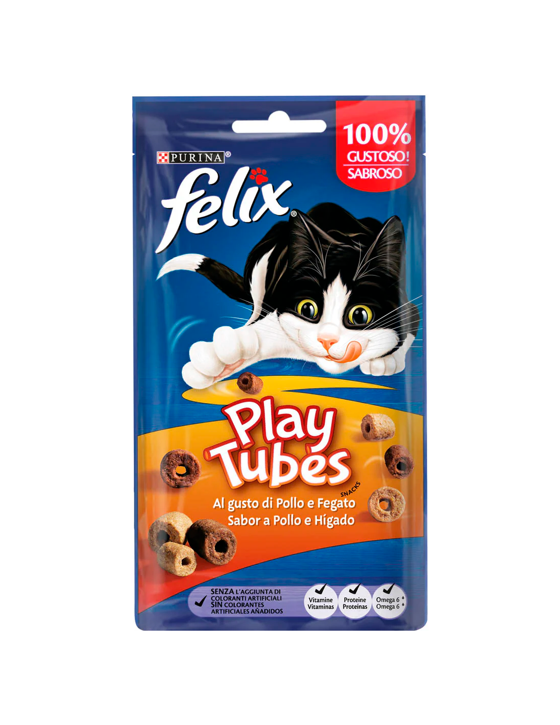 Purina Felix Play Tubes Pollo e Hígado son unos snacks irresistibles y divertidos para tu gato. Con una forma única de cilindro y todo el sabor que adora, estos jugosos snacks están elaborados con ingredientes de calidad, incluyendo proteínas, vitaminas y ácidos grasos Omega 6, para compartir un momento de juego y contribuir a su salud y felicidad.