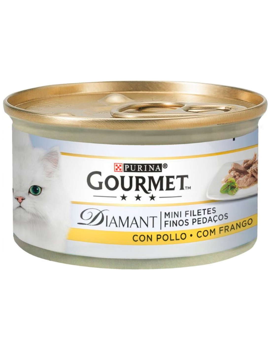 Purina Gourmet Diamant Adult Mini Filetes con Pollo ofrece una experiencia culinaria refinada para gatos adultos. Estas exclusivas recetas presentan excelentes bocados de carne, cuidadosamente preparados y cocinados en una salsa sublime, garantizando un sabor incomparable y una nutrición 100% completa y equilibrada.