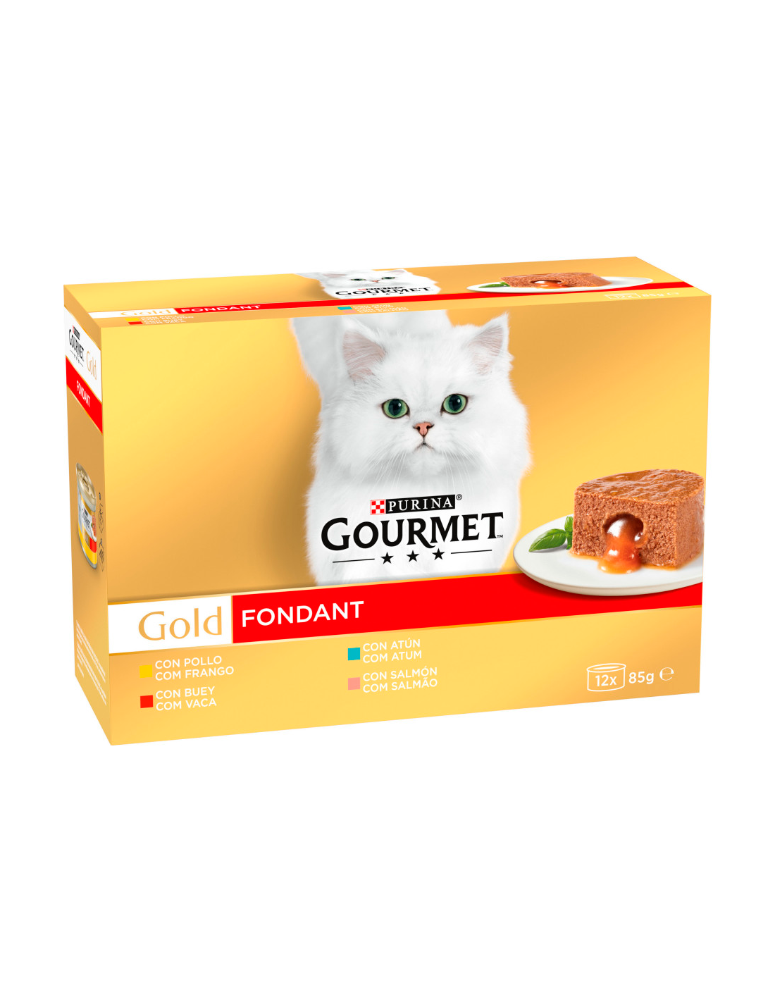 Purina Gourmet Gold Adult Fondant Multi Pack es un alimento 100% completo y equilibrado, elaborado con ingredientes de alta calidad para deleitar a tu gato. Ofrece una delicada mousse con buey, pollo, salmón y otros exquisitos sabores, que esconde un sorprendente corazón líquido de suculenta salsa en su interior.