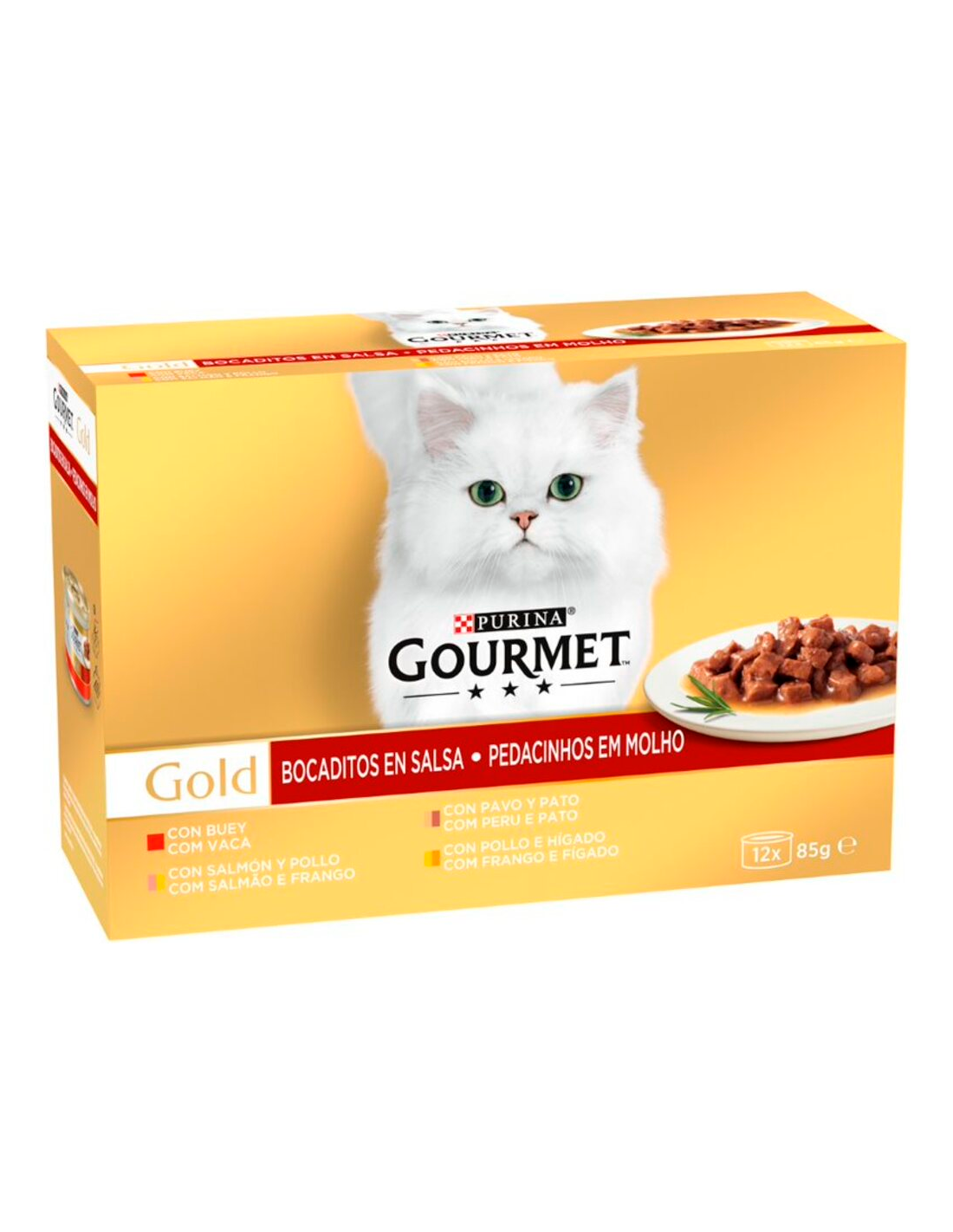 Purina Gourmet Gold Adult Bocaditos en Salsa Multi Pack es un alimento 100% completo y equilibrado, diseñado para deleitar a tu gato. Ofrece tiernos trocitos de carnes o pescados cuidadosamente cocinados en una deliciosa salsa, brindando una experiencia culinaria única con ingredientes de alta calidad para gatos adultos.