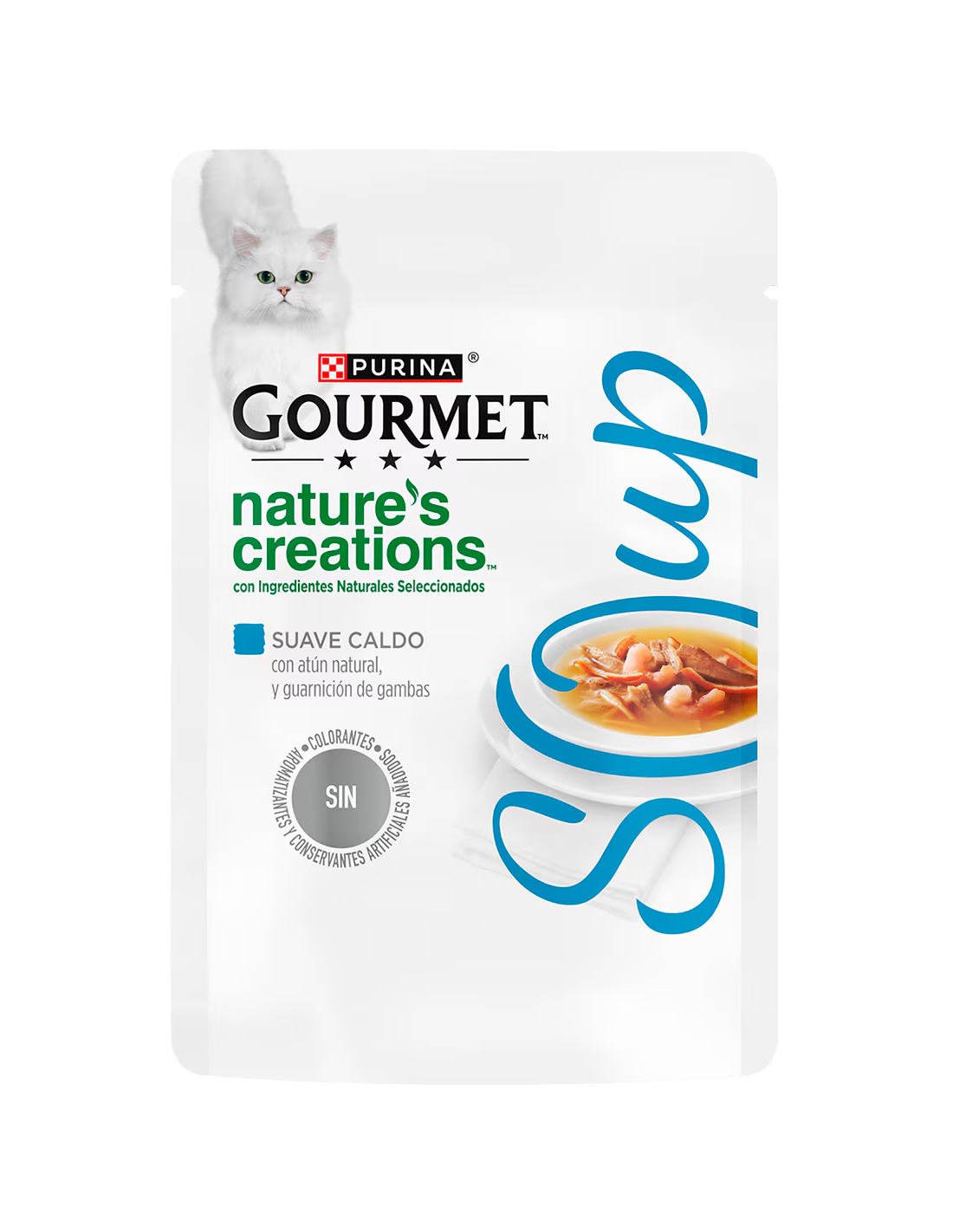 Purina Gourmet Nature's Creations Soup Atún y Gambas es una opción apetitosa y nutritiva para gatos adultos. Su receta con pollo natural en un suave caldo proporciona hidratación y una variedad de sabores y texturas, ideal como suplemento ocasional.