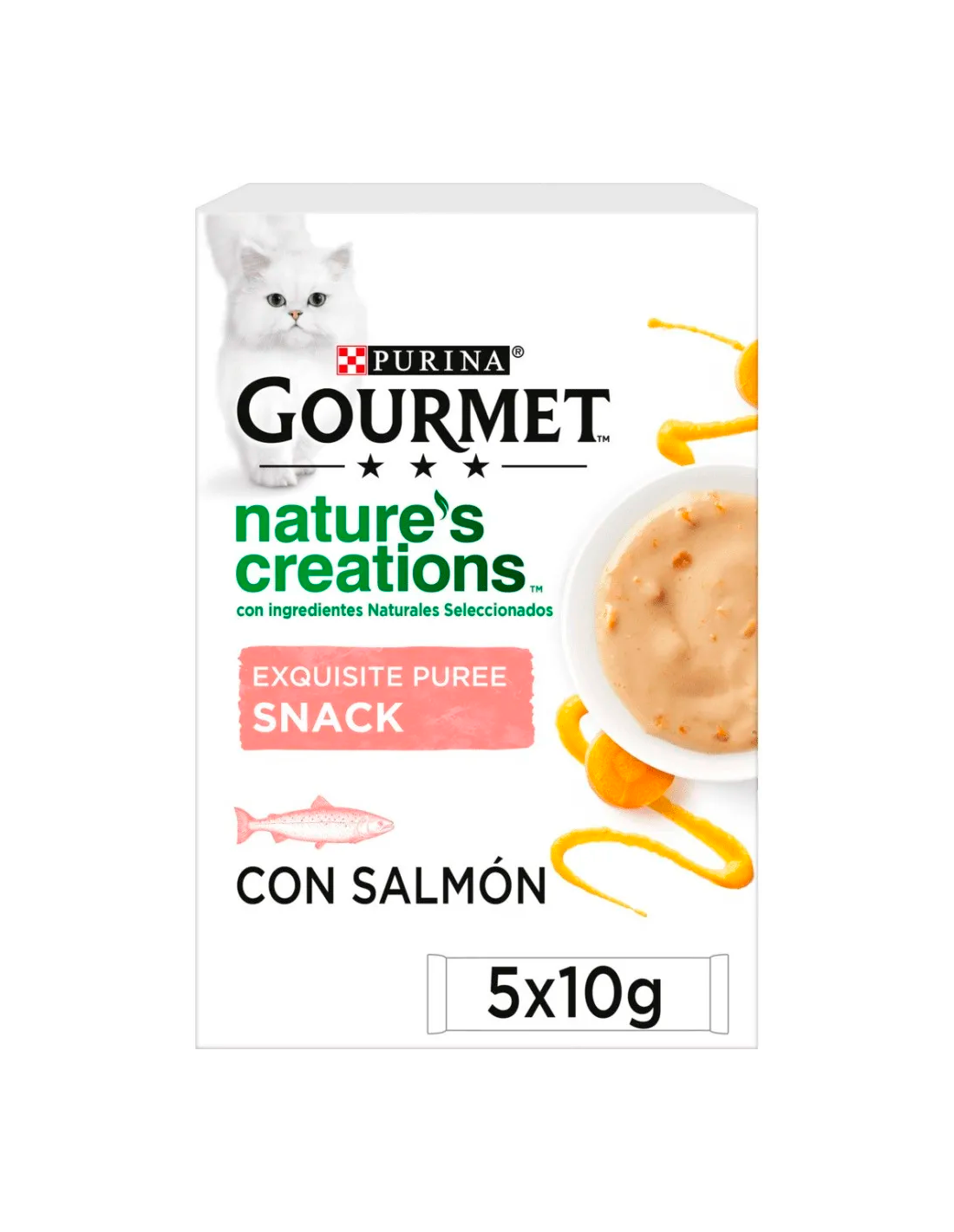 Purina Gourmet Nature's Creations Puré Salmón y Zanahoria es un alimento complementario para gatos adultos, elaborado con ingredientes naturales seleccionados. Una receta delicada y sabrosa con salmón y un toque de zanahoria, presentada en bolsitas de 10g para un delicioso disfrute entre comidas.