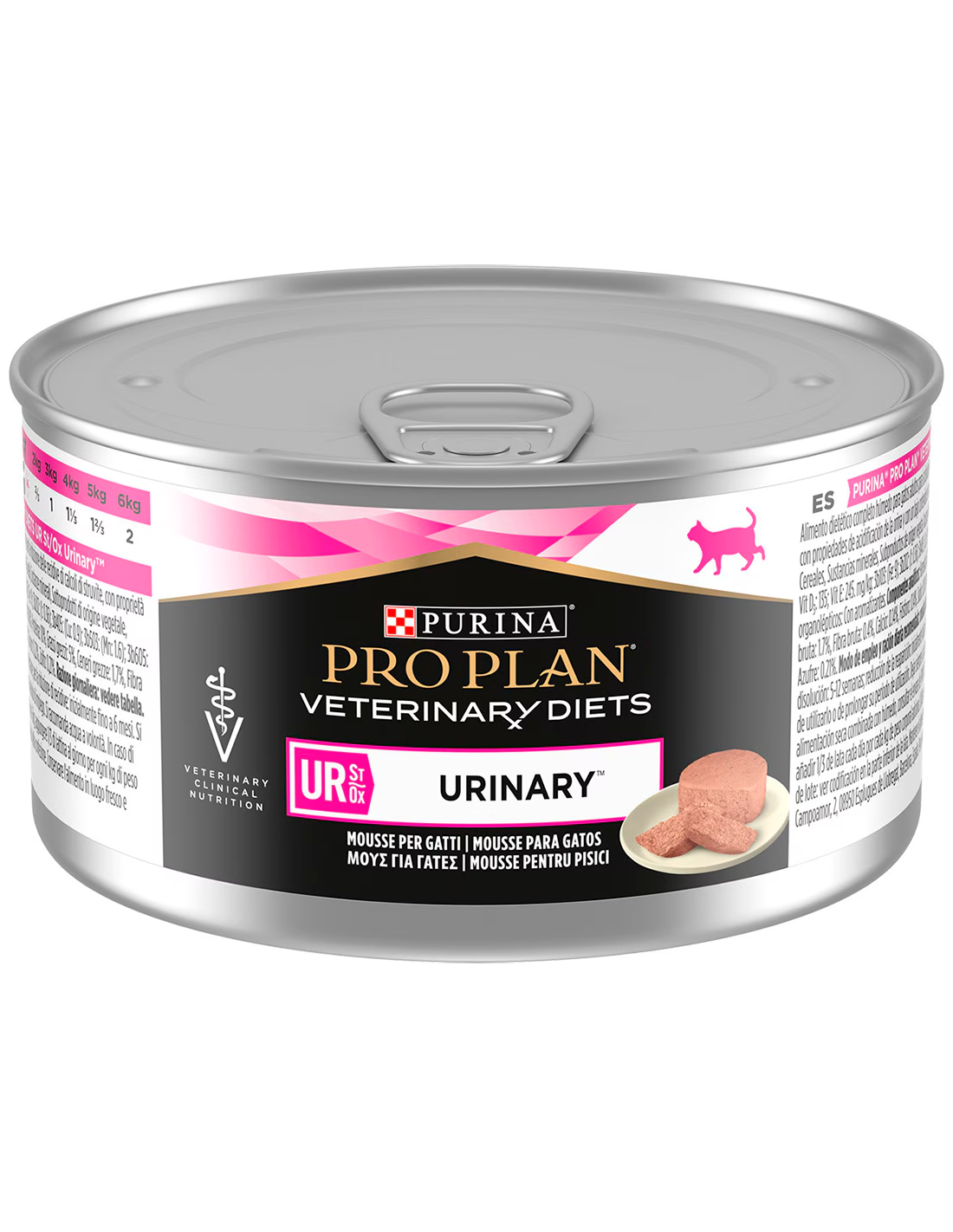 Purina Pro Plan Veterinary Diets Cat UR Urinary Mousse es un alimento dietético completo en lata para gatos adultos, formulado para la disolución y reducción de la reaparición de cálculos de estruvita. Con seguridad urinaria St/Ox, bajo contenido de magnesio y niveles moderados de calorías, ayuda a mantener un peso corporal ideal.