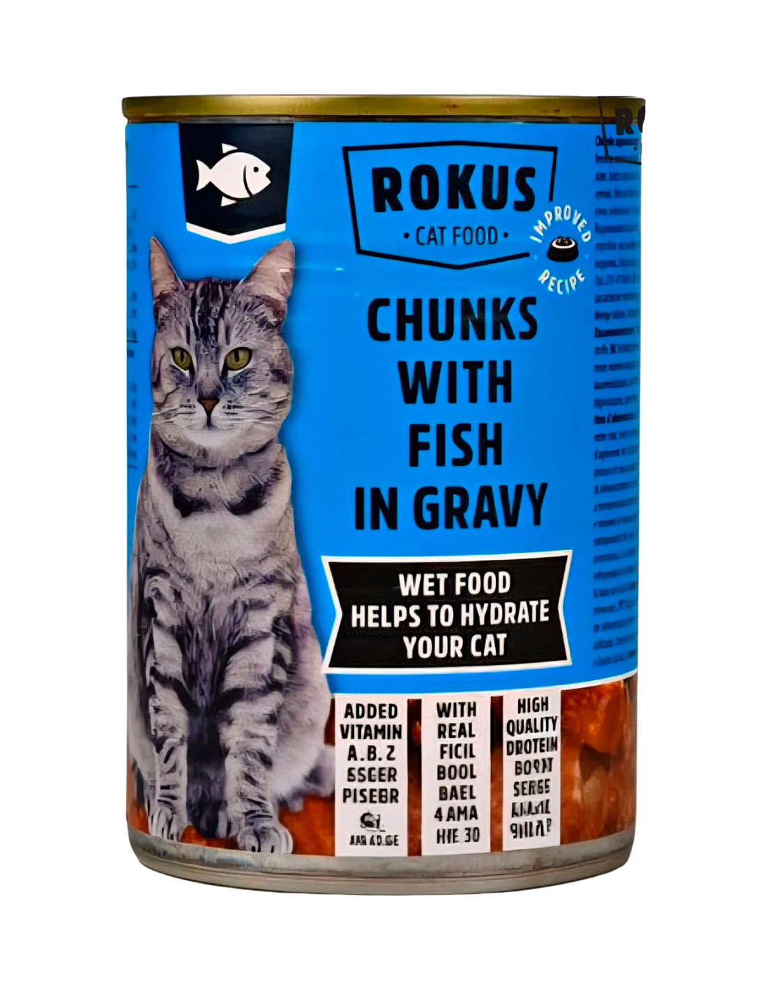Rokus Cat Trozos de Pescado en Salsa es un alimento húmedo completo en lata de 415 gr, diseñado para gatos adultos. Su textura de "bocaditos" en salsa no solo favorece la hidratación, sino que también ofrece una alta palatabilidad, combinando carne (pollo), pescado (salmón y atún) y otros ingredientes.
