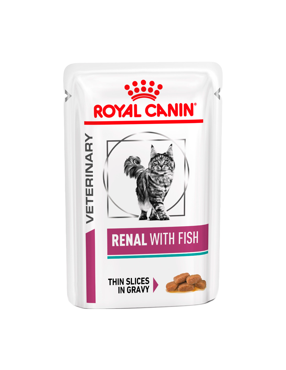 ROYAL CANIN® Renal with Fish es un alimento húmedo dietético completo formulado para apoyar la función renal en casos de insuficiencia renal crónica y para reducir la formación de cálculos de oxalato. Contiene proteínas de alta calidad, niveles restringidos de fósforo, calcio y vitamina D, y propiedades alcalinizantes de la orina.