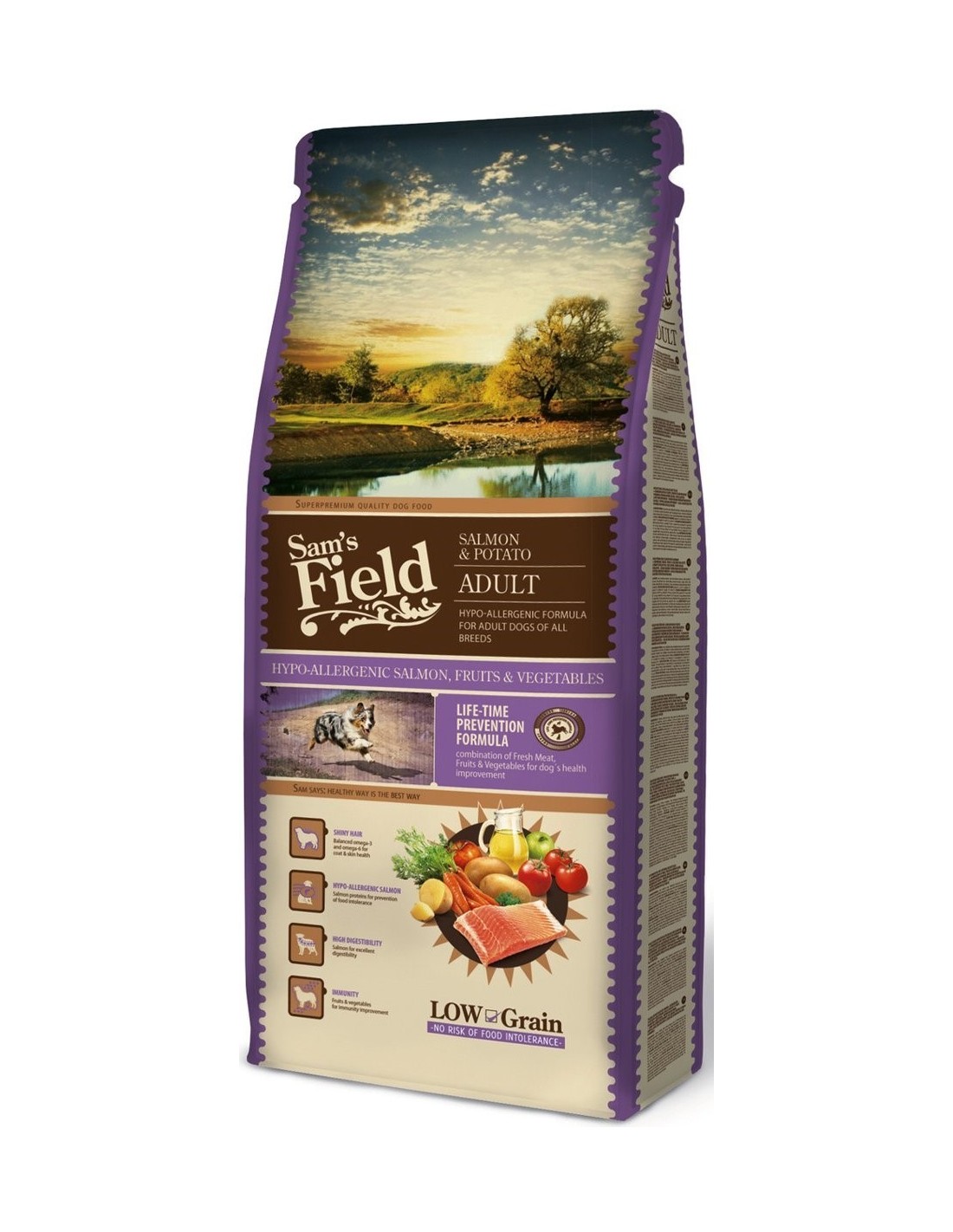 Sam's Field salmón, frutas y hortalizas es un pienso hipoalergénico para perros de todas las razas. Formulado para perros con problemas de intolerancias o alergias. No contiene productos transgénicos.