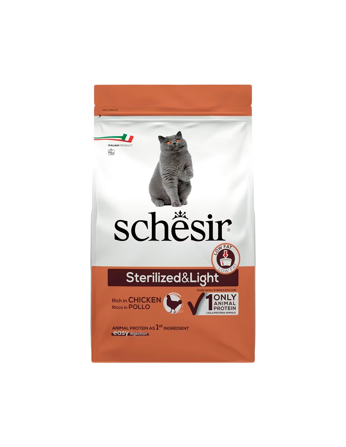 Schesir Sterilized & Light Gato es un alimento seco completo y equilibrado, formulado con una única fuente de proteína animal (pollo) como primer ingrediente. Ideal para gatos adultos esterilizados o con tendencia al sobrepeso, gracias a su bajo contenido en grasa y alto contenido en fibra, ayudando a mantener el peso correcto.