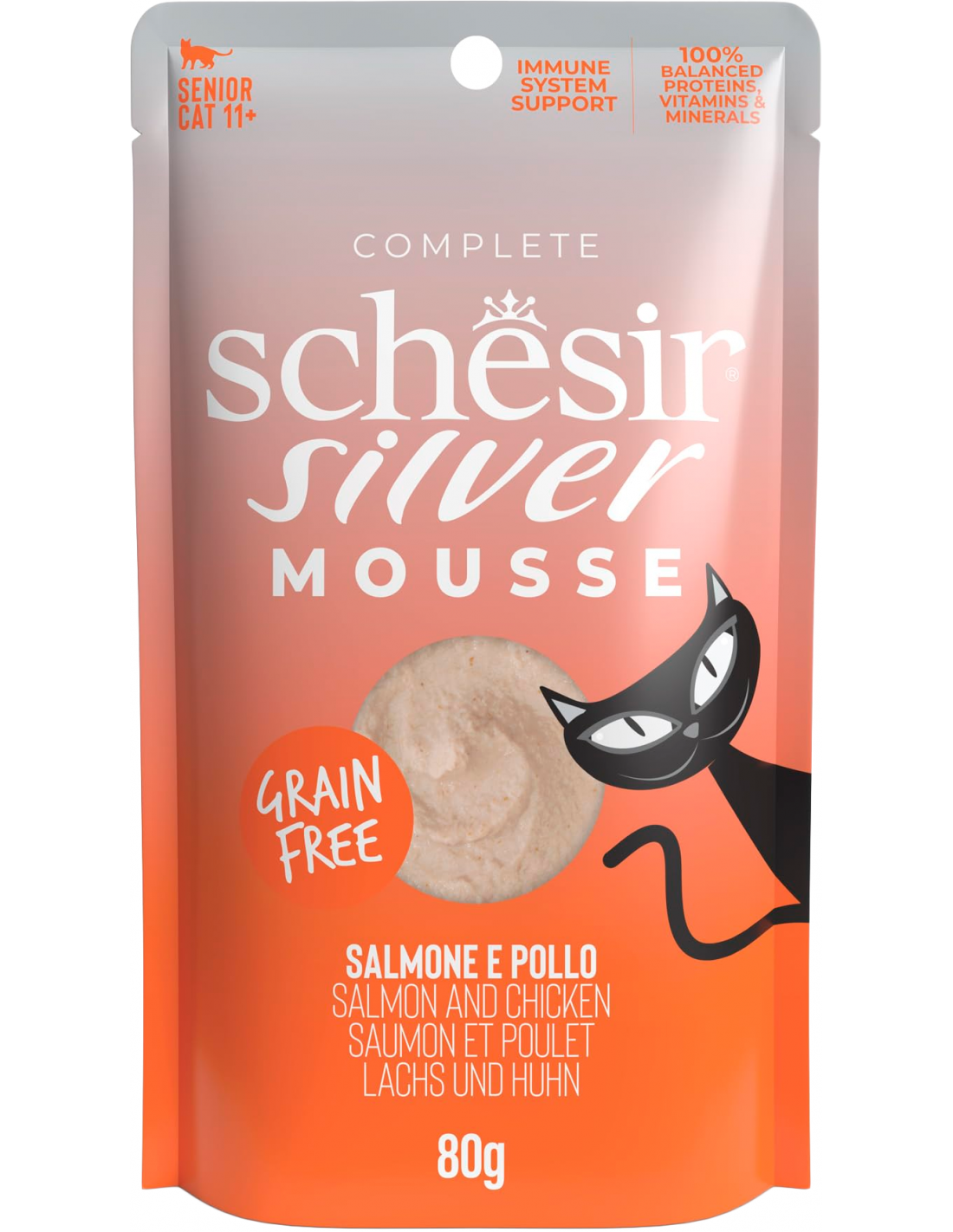Mousse completa de salmón (31%) y pollo (29%), sin cereales, para gatos mayores (+11 años), formulada para el sistema inmunitario. Sobre de 80 gr.