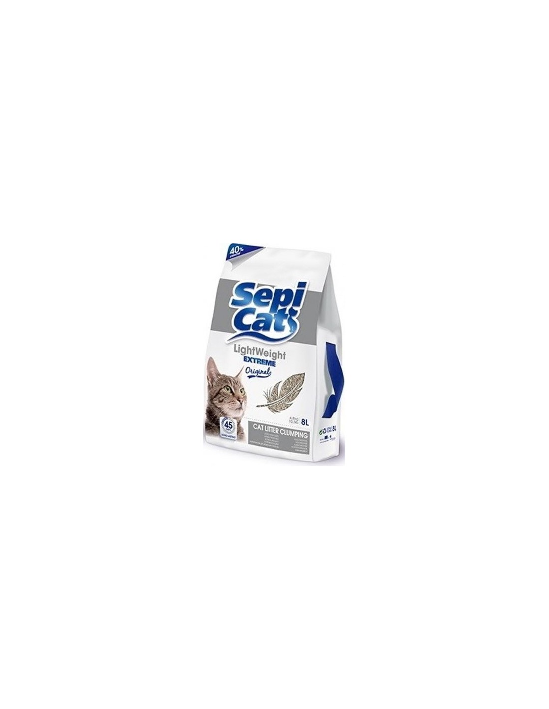 - Consumo mínimo: Un envase de 8 litros de Sepicat LightWeight Extreme Original dura hasta 45 días. (para un gato de un tamaño medio de 5 Kg).