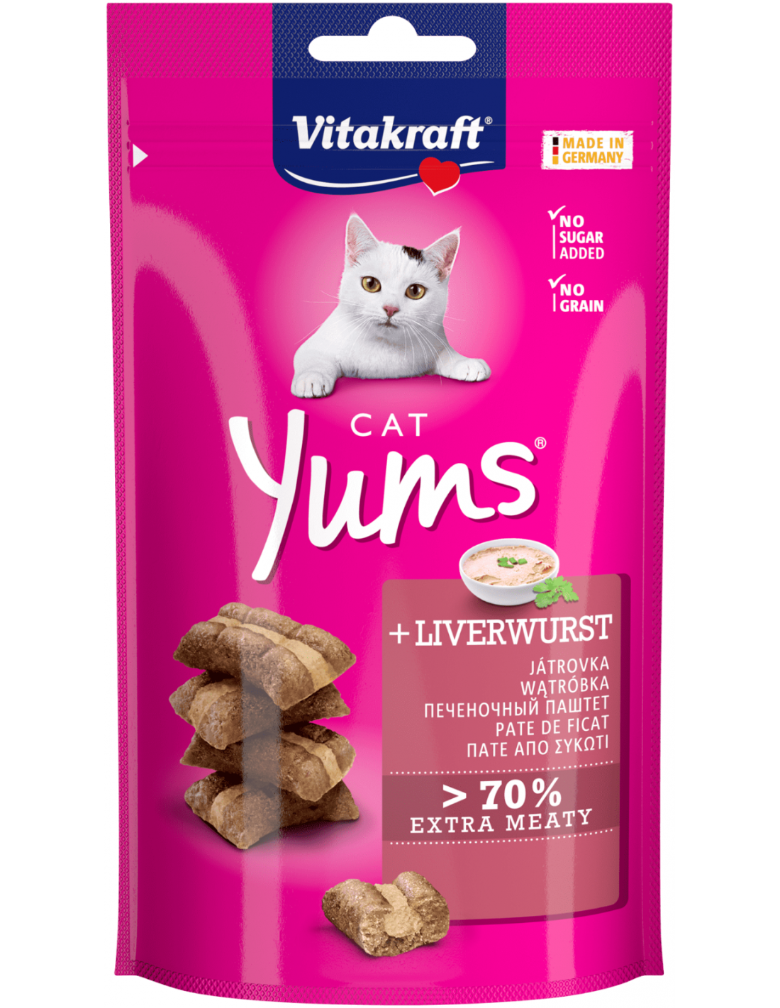 Vitakraft Cat Yums con Paté son snacks semihúmedos para gatos, horneados lentamente para una textura tierna y jugosa que encantará a tu felino. Elaborados con más del 70% de carne y un delicioso relleno de paté de hígado, son la recompensa perfecta, sin azúcar, soja ni cereales.