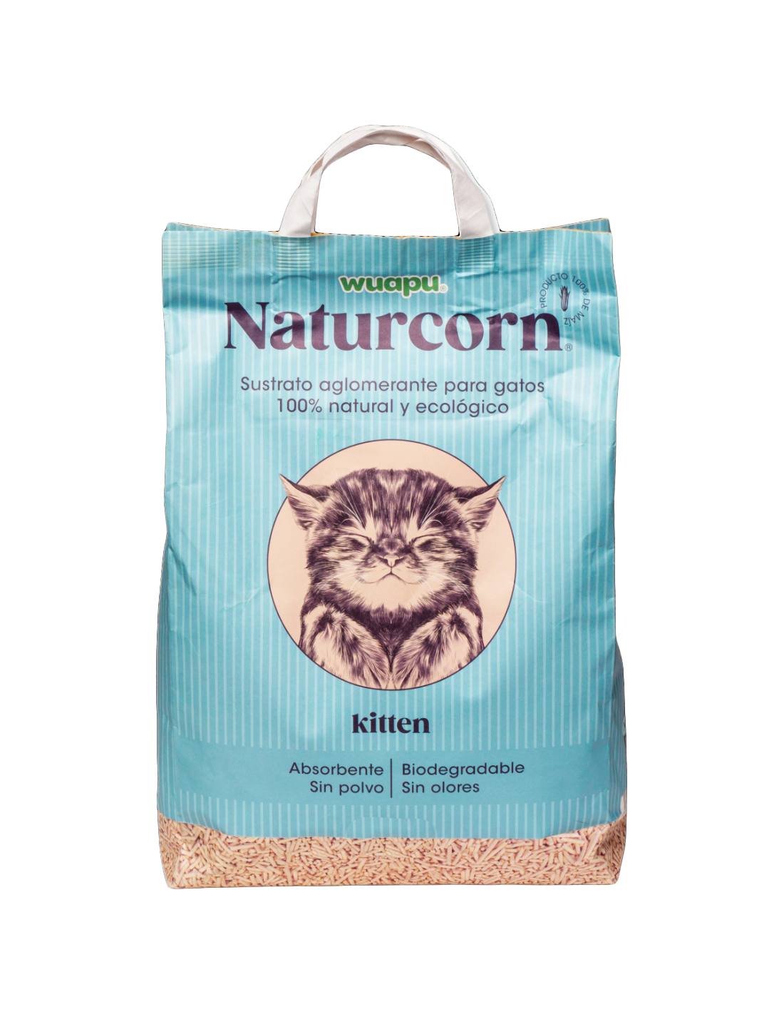 Wuapu Naturcorn Kitten es un sustrato innovador y absorbente para gatitos, fabricado 100% de maíz triturado. Es completamente natural, biodegradable y libre de polvo, con un fresco aroma. Su forma cilíndrica de pequeño diámetro protege las patitas de los gatitos, aglomera eficazmente los desechos, neutraliza los malos olores y puede desecharse por el inodoro o usarse como compostaje.